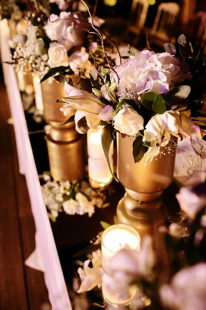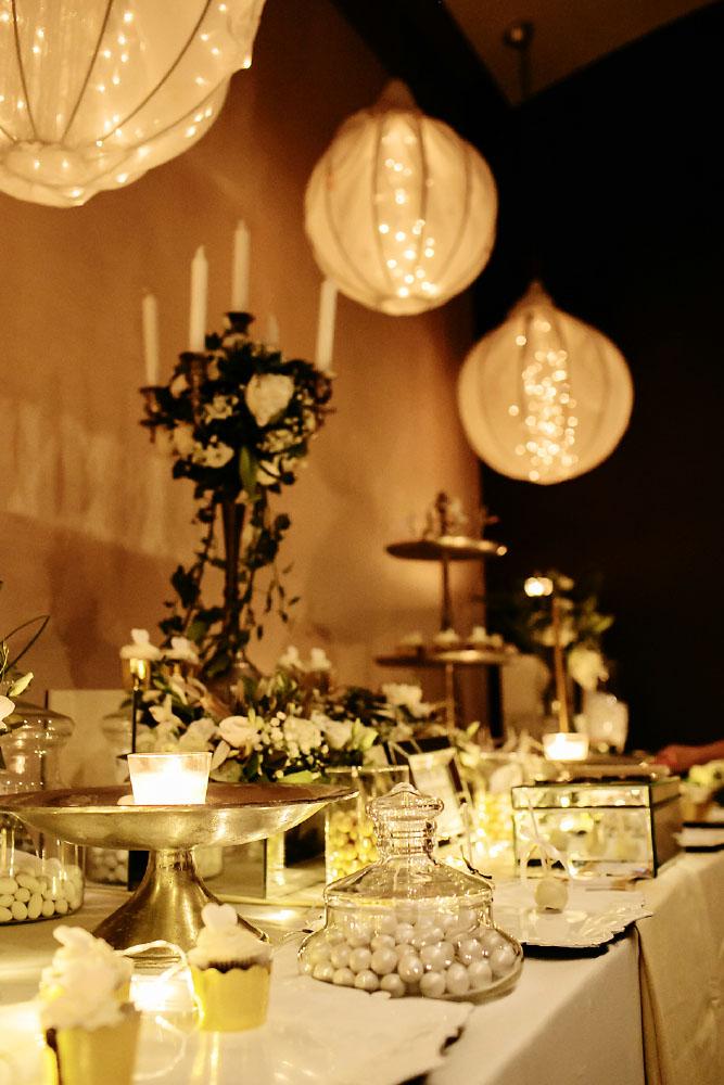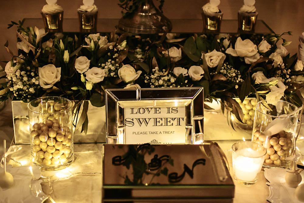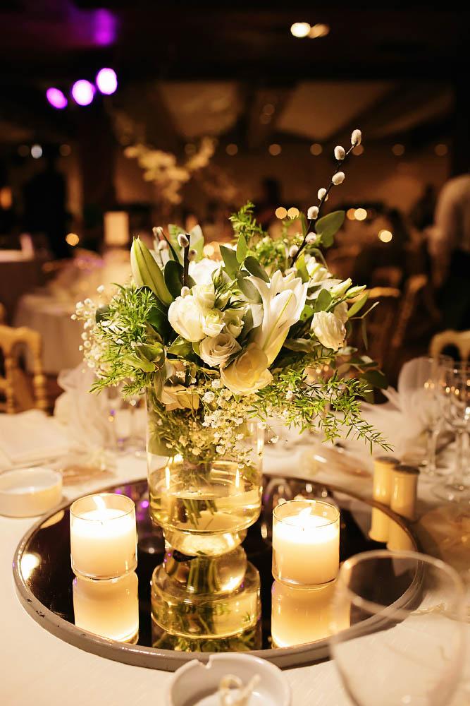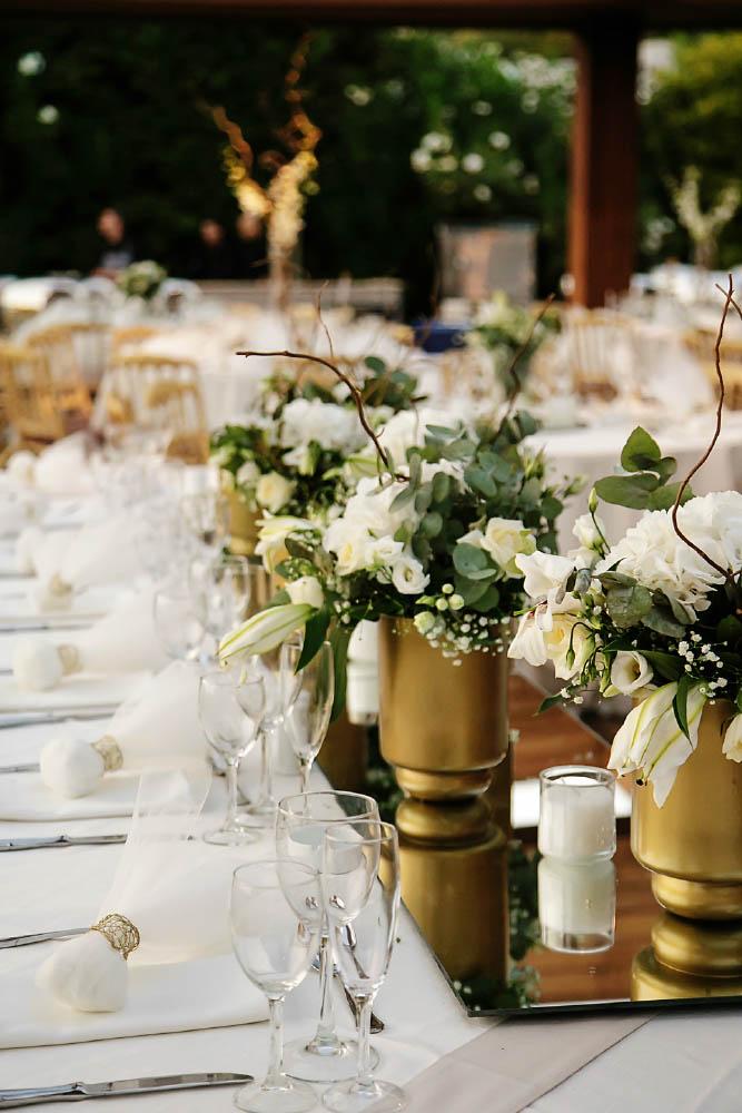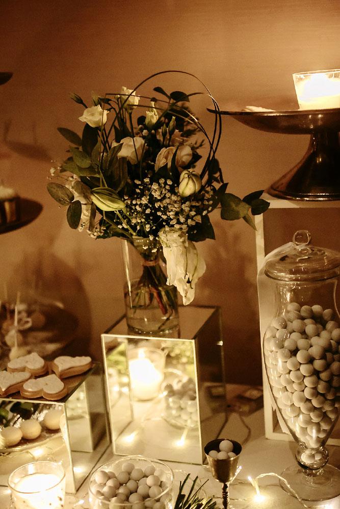 The brief was to create something exquisitely beautiful whilst embracing a modern elegance using a neutral palette with hints of gold. The tables were modern with arrangements of hydrangeas, garden roses, eucalyptus leaves and lilies arranged in glass vases, placed on mirrors. The other half of the tables had salix branches adorned with dendrobium orchids also placed on a mirror. The candy/ wish table decorated with mirrors and gold details, had a selection of Greek sweets such as kourabiedes, pastelia and loukoumia as well as cupcakes, fondant biscuits and cake pops which had a touch of gold.