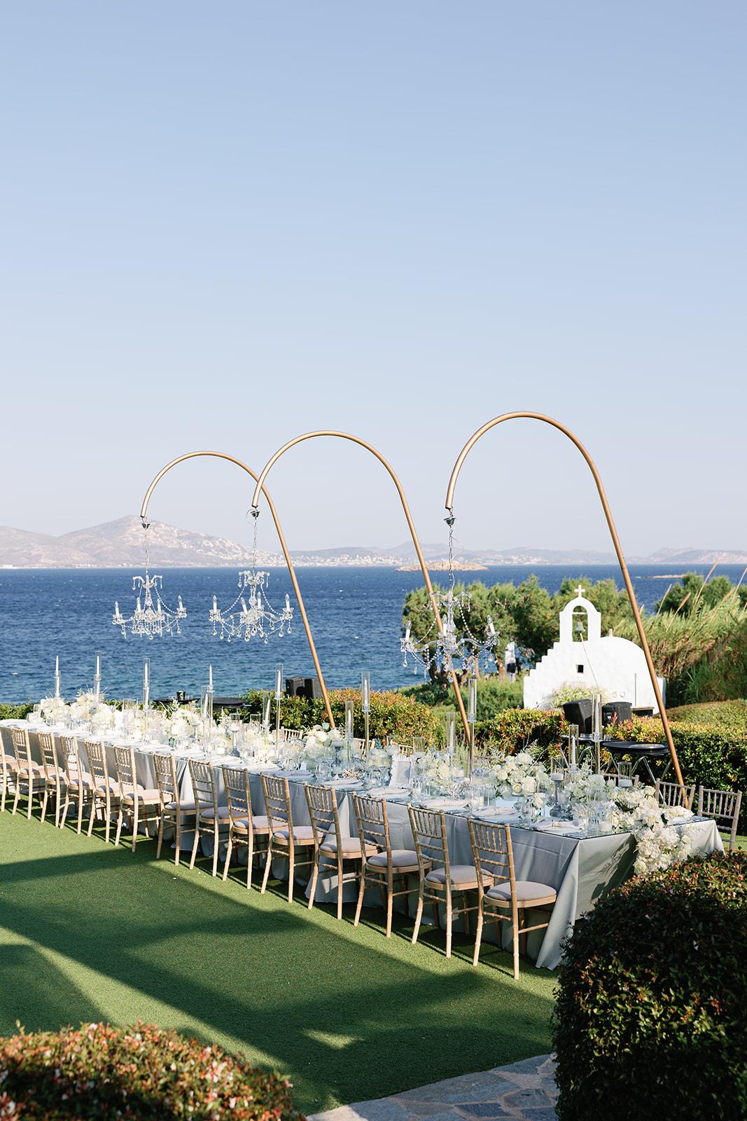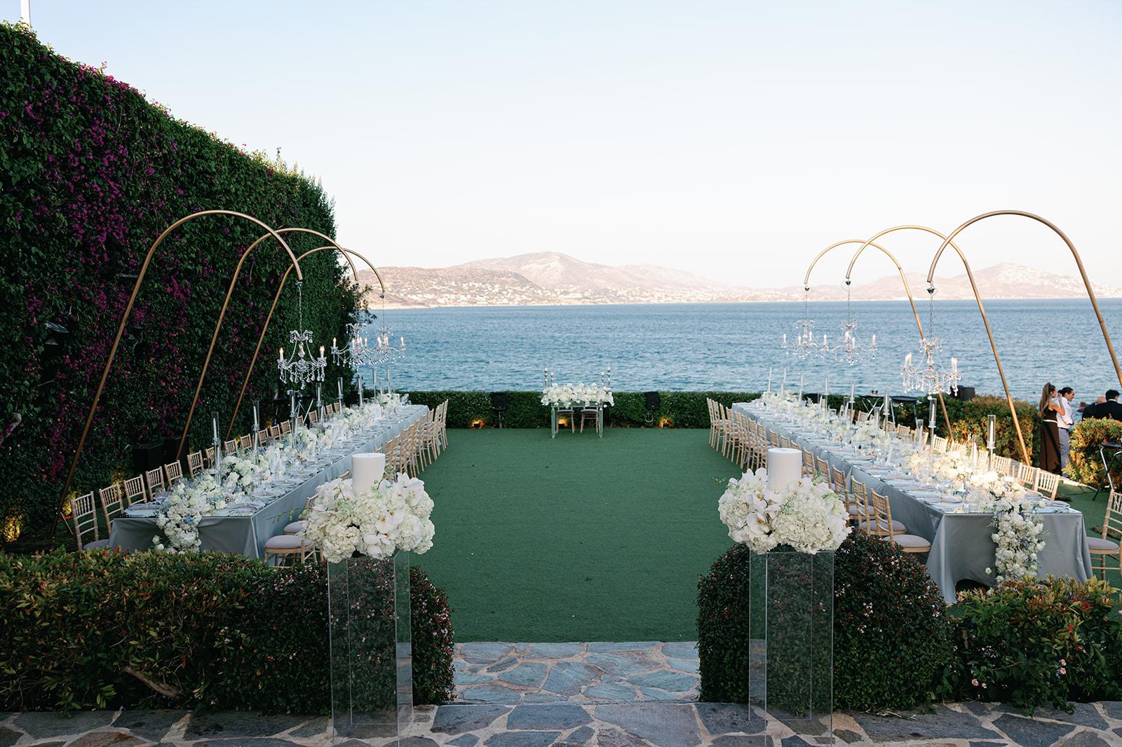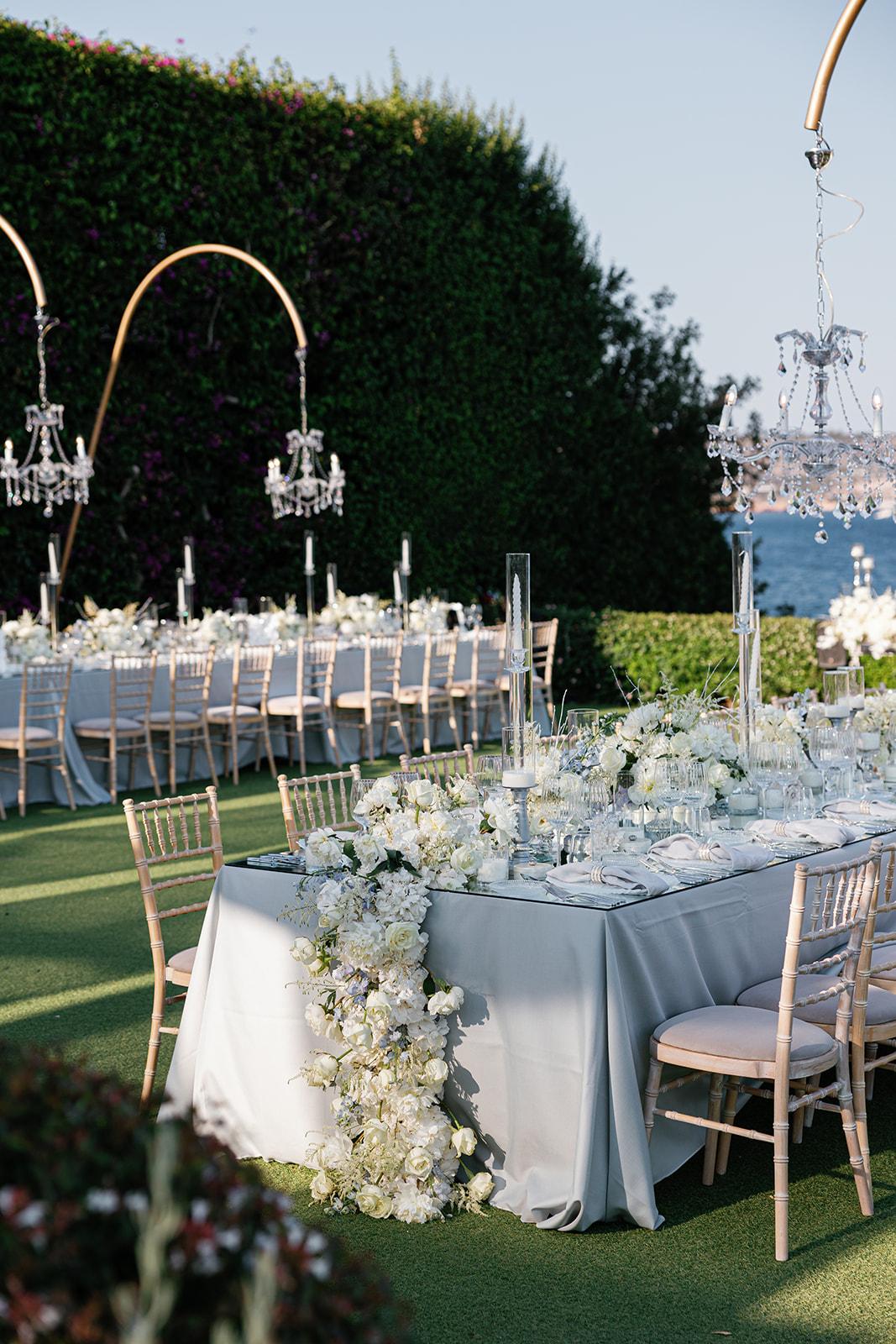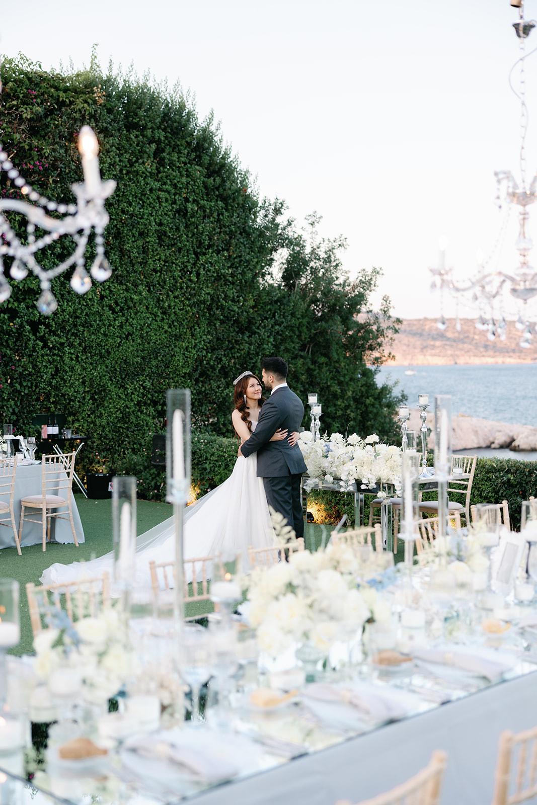 Amidst this dreamlike setting, two long white banquet tables with mirrored tops took center stage, reflecting the beauty of the surroundings. These tables were adorned with exquisite white shells made of mother of pearl and delicate white coral, as well as an abundance of low candles and tall crystal candlesticks. The candles' soft, flickering light added a touch of warmth and intimacy, while the fragrant white hydrangeas, roses, and peonies gracing the tables filled the air with their sweet aroma. Above, large crystal chandeliers hung over the tables, their multifaceted brilliance reflecting the love and joy that radiated from the bride and groom, making this Athenian Riviera wedding an unforgettable celebration of love and nature's timeless beauty.
