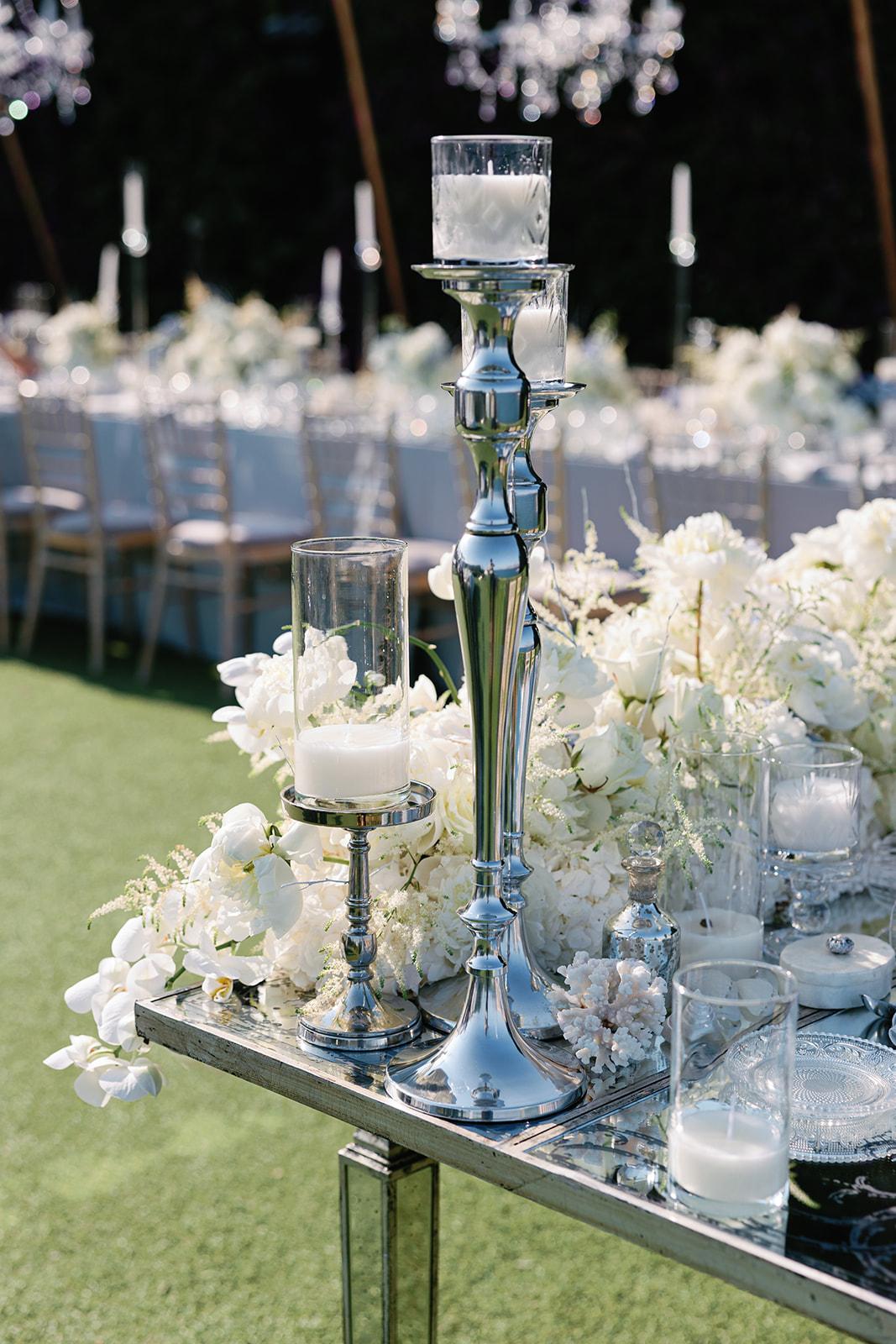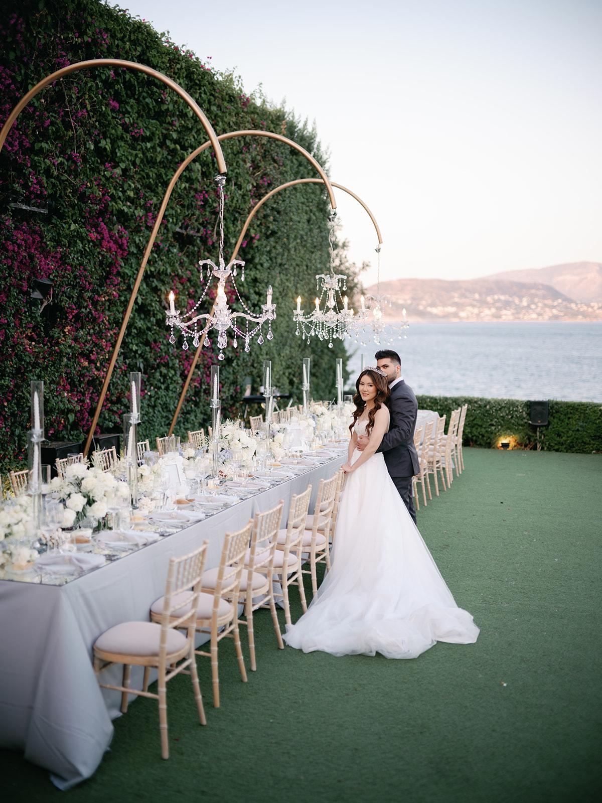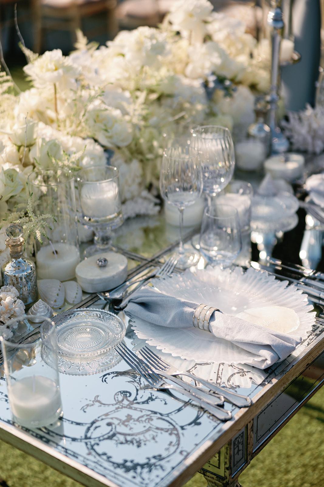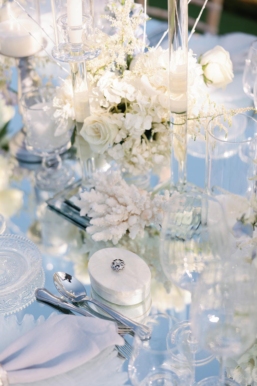 Amidst this dreamlike setting, two long white banquet tables with mirrored tops took center stage, reflecting the beauty of the surroundings. These tables were adorned with exquisite white shells made of mother of pearl and delicate white coral, as well as an abundance of low candles and tall crystal candlesticks. The candles' soft, flickering light added a touch of warmth and intimacy, while the fragrant white hydrangeas, roses, and peonies gracing the tables filled the air with their sweet aroma. Above, large crystal chandeliers hung over the tables, their multifaceted brilliance reflecting the love and joy that radiated from the bride and groom, making this Athenian Riviera wedding an unforgettable celebration of love and nature's timeless beauty.