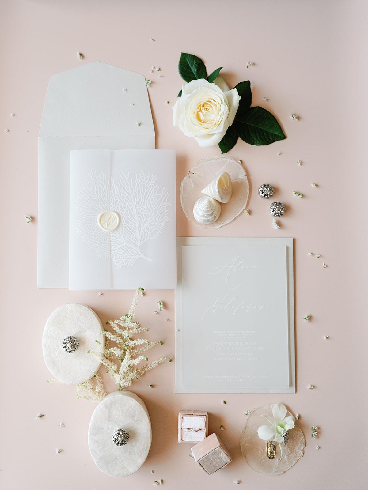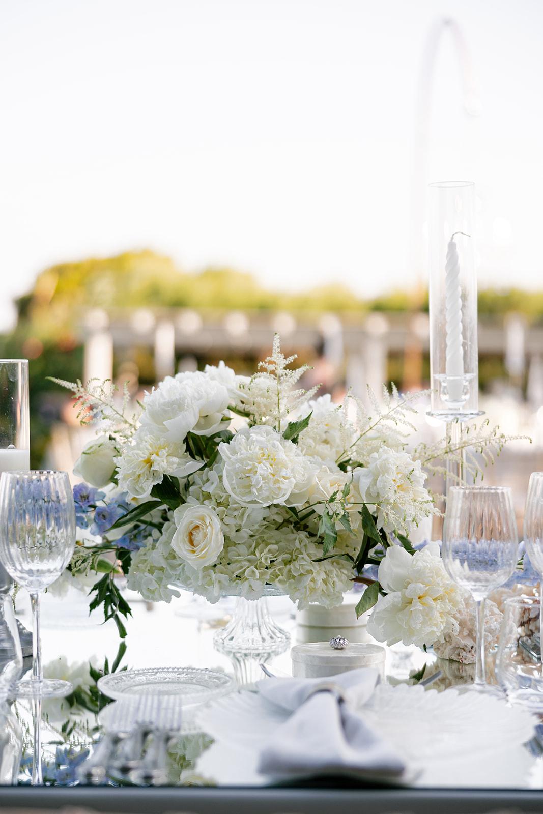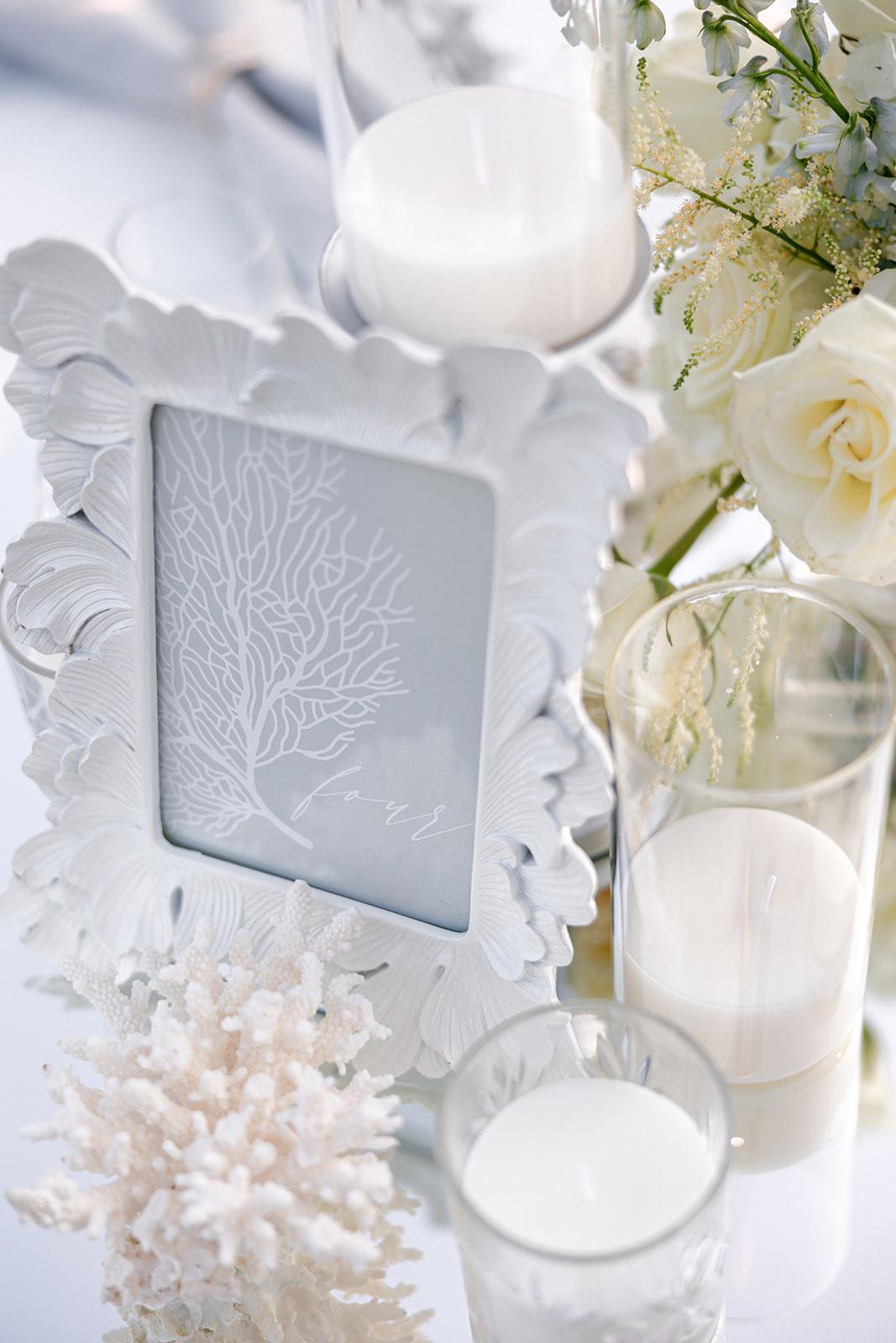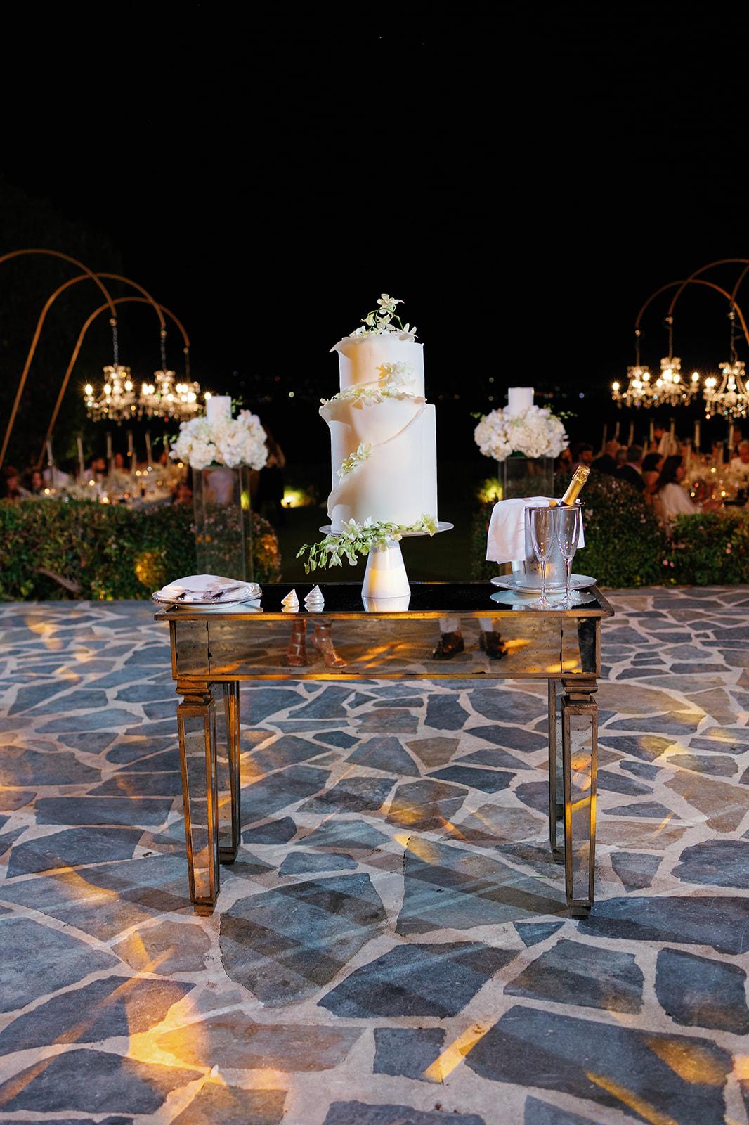 Amidst this dreamlike setting, two long white banquet tables with mirrored tops took center stage, reflecting the beauty of the surroundings. These tables were adorned with exquisite white shells made of mother of pearl and delicate white coral, as well as an abundance of low candles and tall crystal candlesticks. The candles' soft, flickering light added a touch of warmth and intimacy, while the fragrant white hydrangeas, roses, and peonies gracing the tables filled the air with their sweet aroma. Above, large crystal chandeliers hung over the tables, their multifaceted brilliance reflecting the love and joy that radiated from the bride and groom, making this Athenian Riviera wedding an unforgettable celebration of love and nature's timeless beauty.