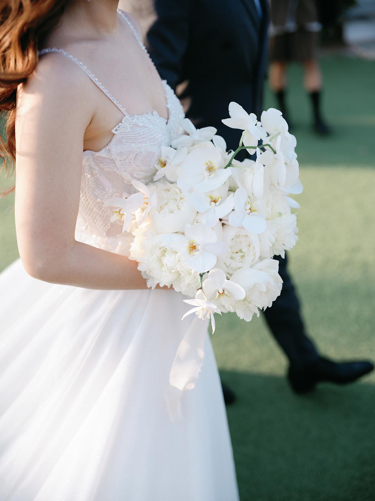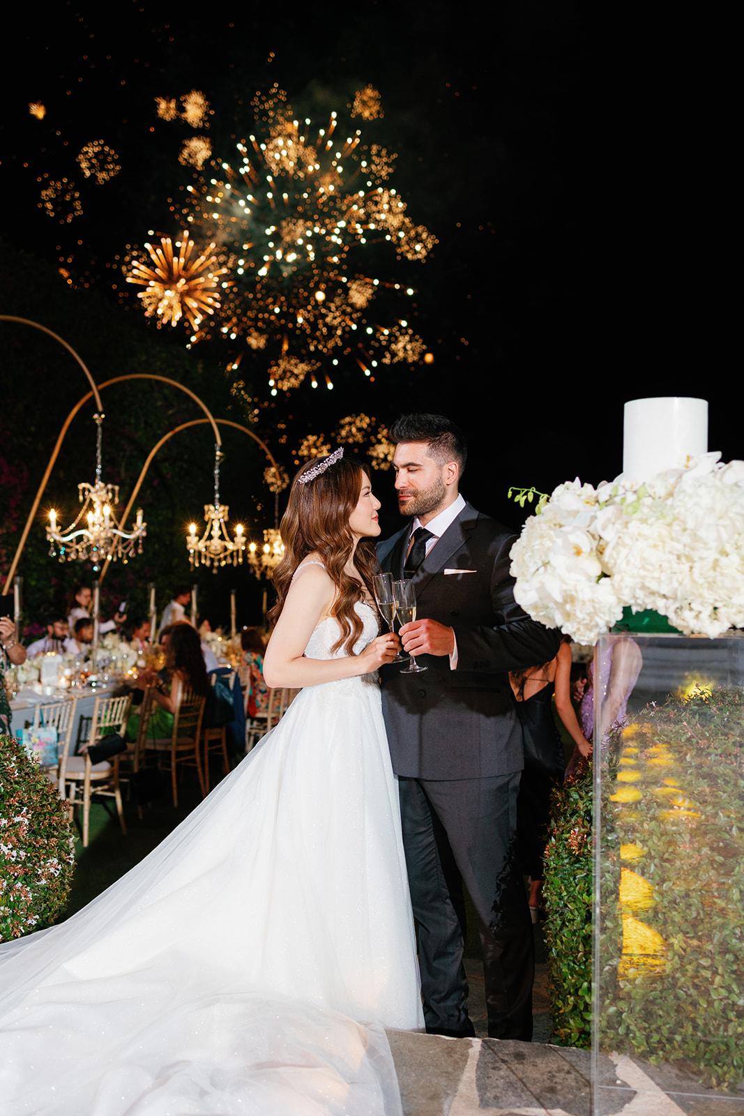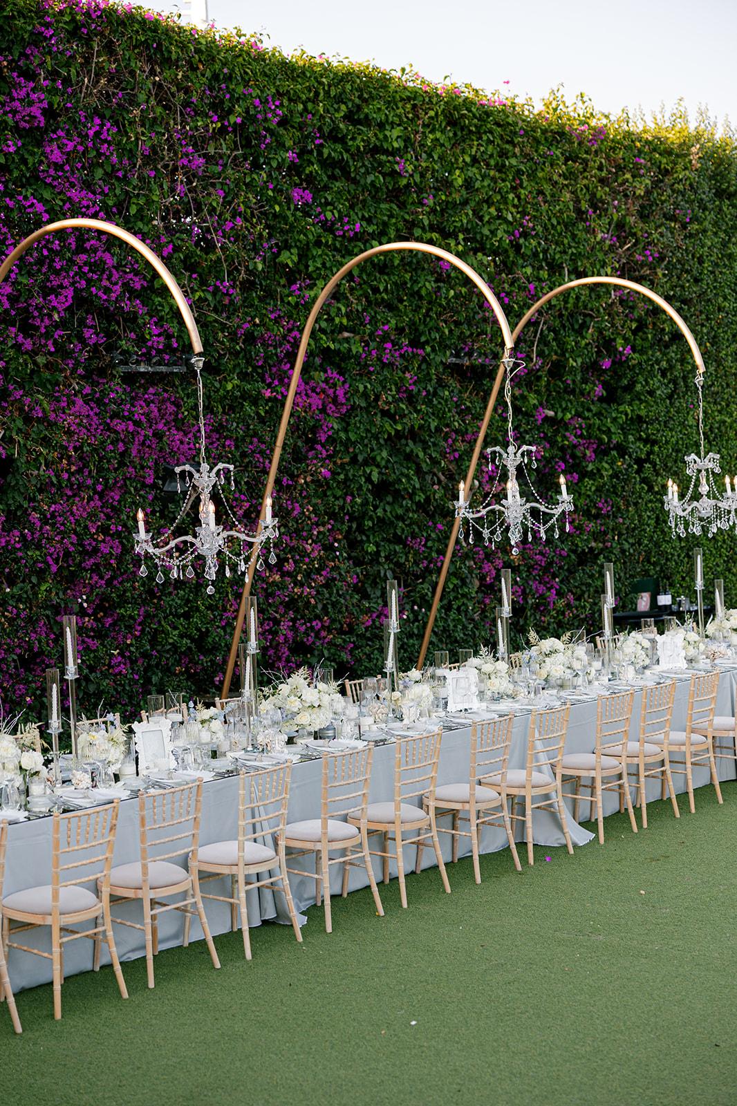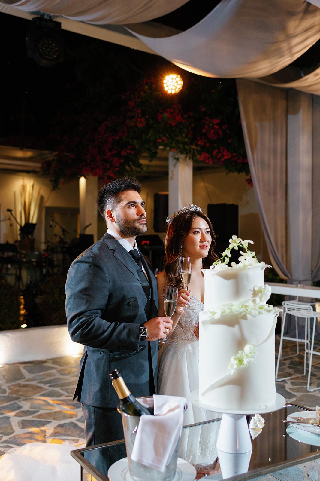 Amidst this dreamlike setting, two long white banquet tables with mirrored tops took center stage, reflecting the beauty of the surroundings. These tables were adorned with exquisite white shells made of mother of pearl and delicate white coral, as well as an abundance of low candles and tall crystal candlesticks. The candles' soft, flickering light added a touch of warmth and intimacy, while the fragrant white hydrangeas, roses, and peonies gracing the tables filled the air with their sweet aroma. Above, large crystal chandeliers hung over the tables, their multifaceted brilliance reflecting the love and joy that radiated from the bride and groom, making this Athenian Riviera wedding an unforgettable celebration of love and nature's timeless beauty.