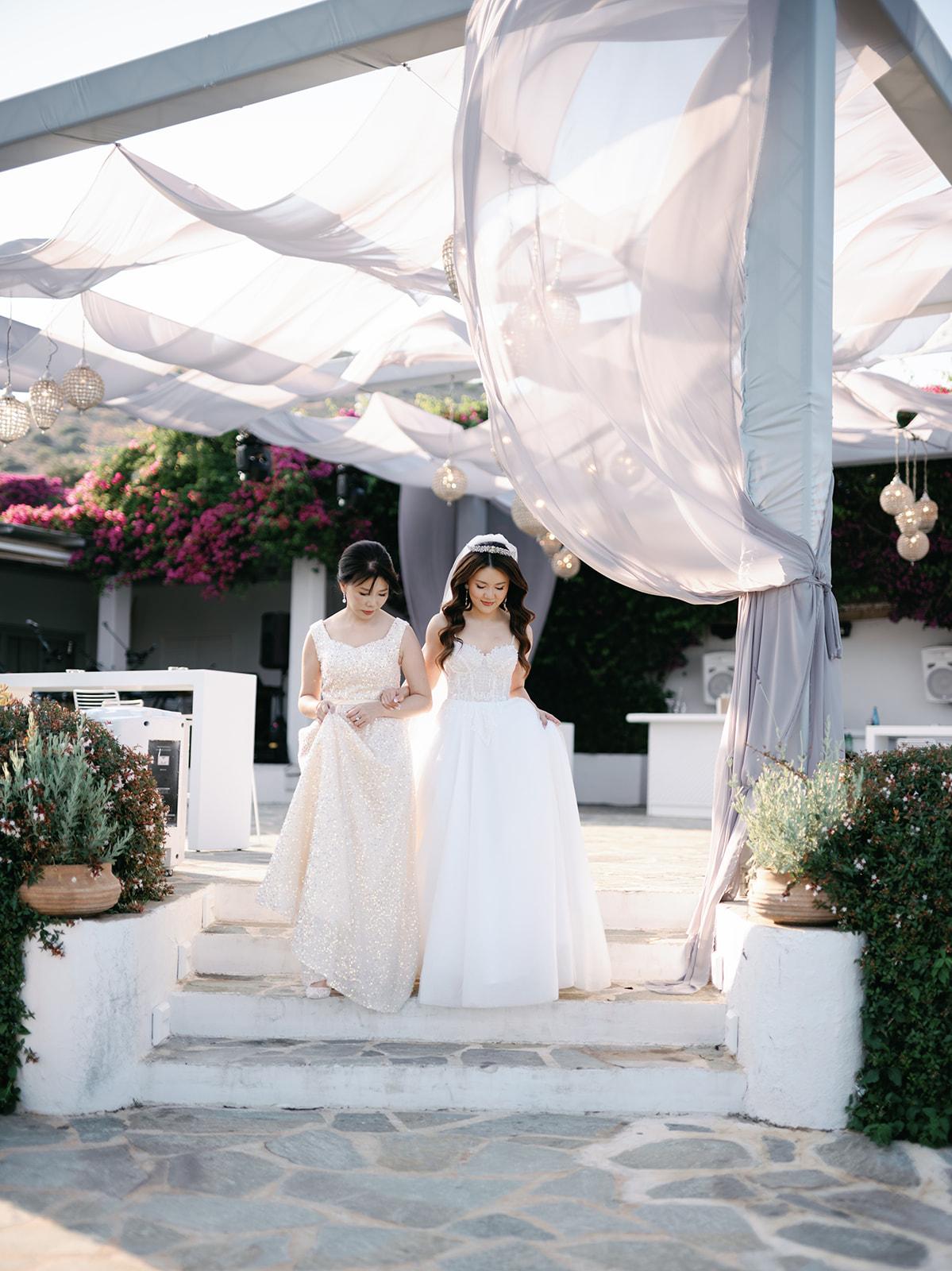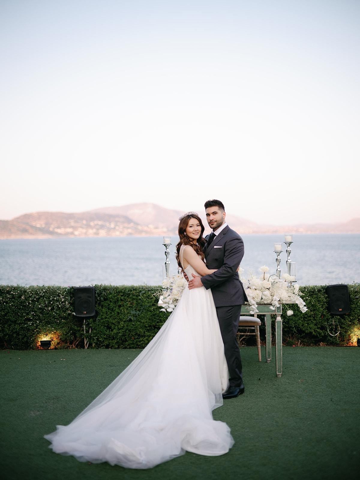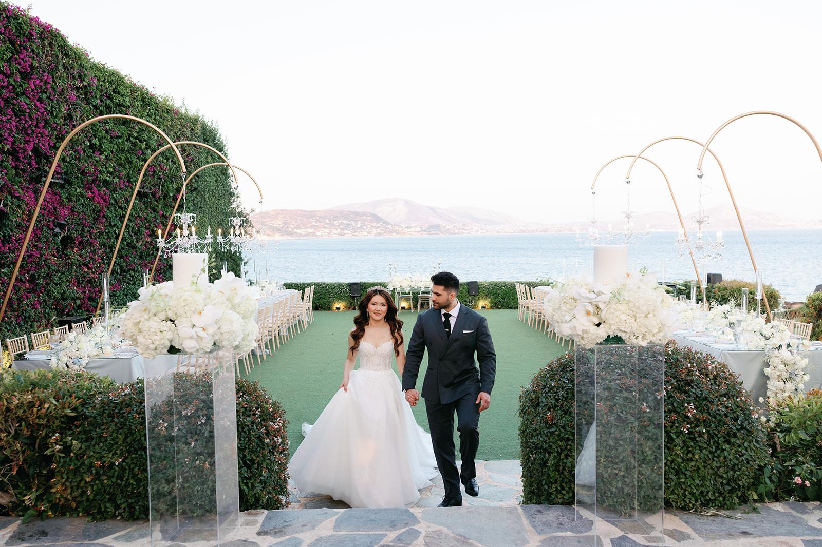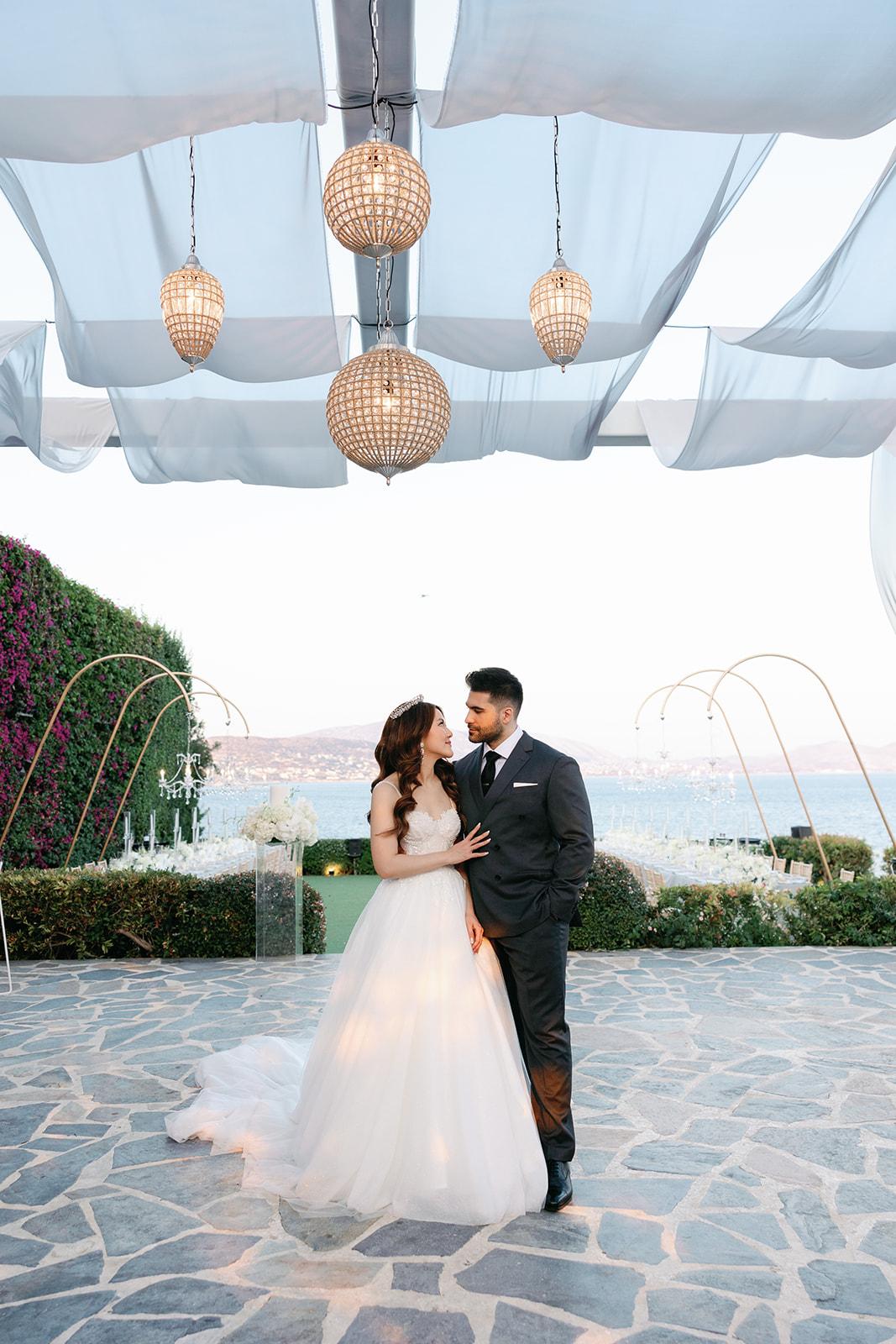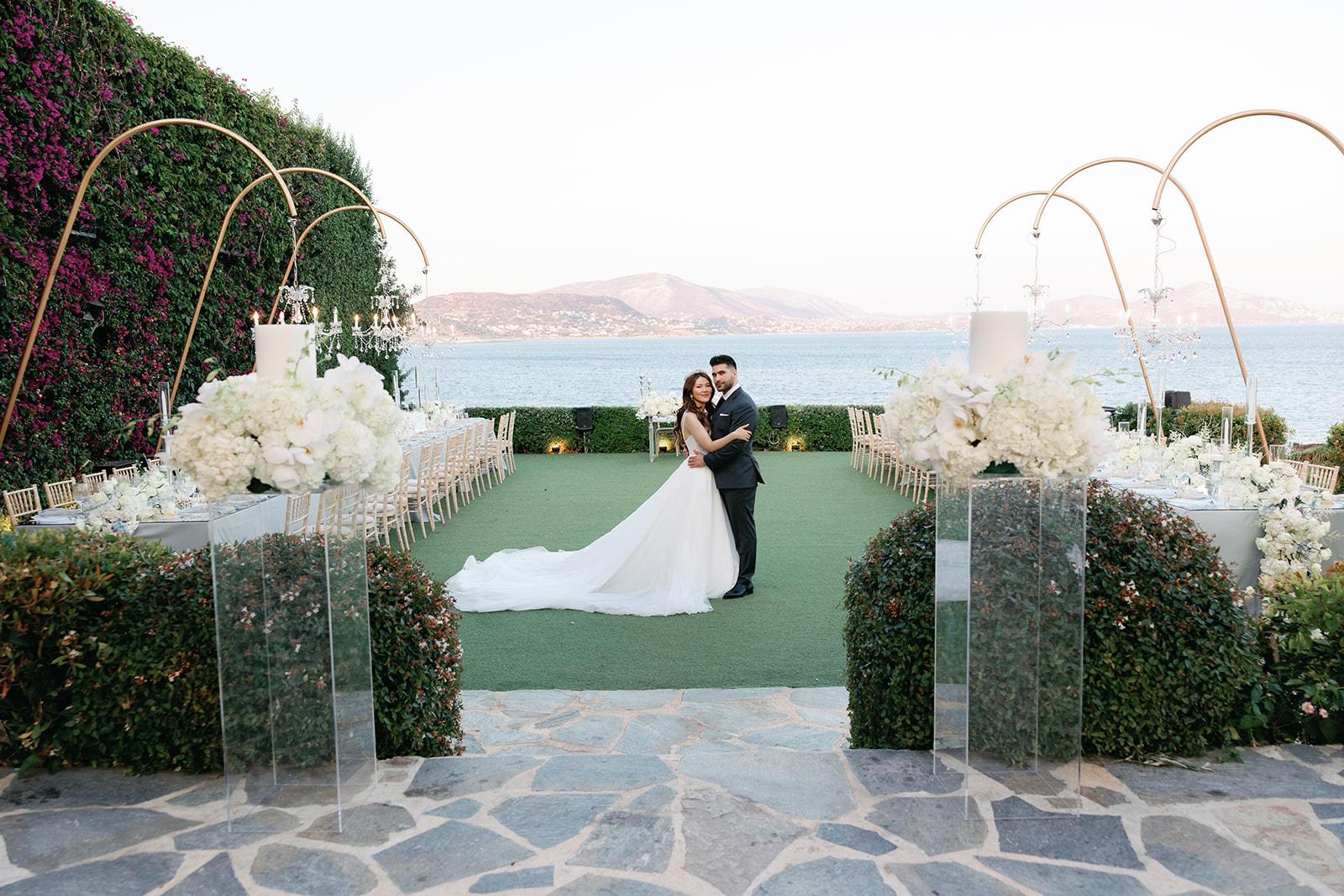 On the sun-kissed Athenian Riviera, with the Aegean Sea stretching out as far as the eye could see, a magical outdoor wedding unfolded under the theme of "Mother of Pearl Ocean." The setting was nothing short of enchanting, with a large structure gracefully hovering above the dance floor, its grandeur softened by flowing grey chiffon billowing in the gentle sea breeze. This celestial canopy set the stage for a night of love and celebration, as the bride and groom prepared to embark on their journey together.