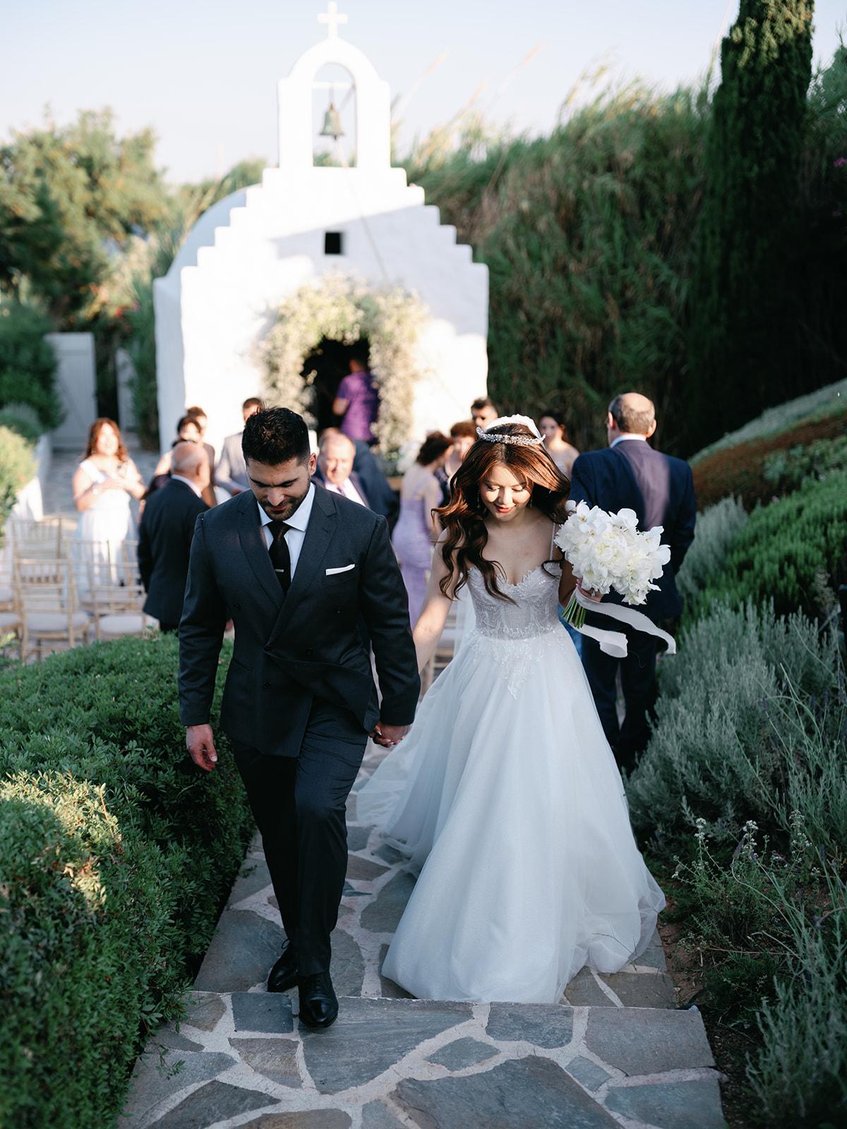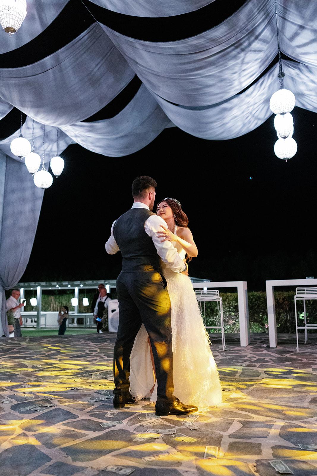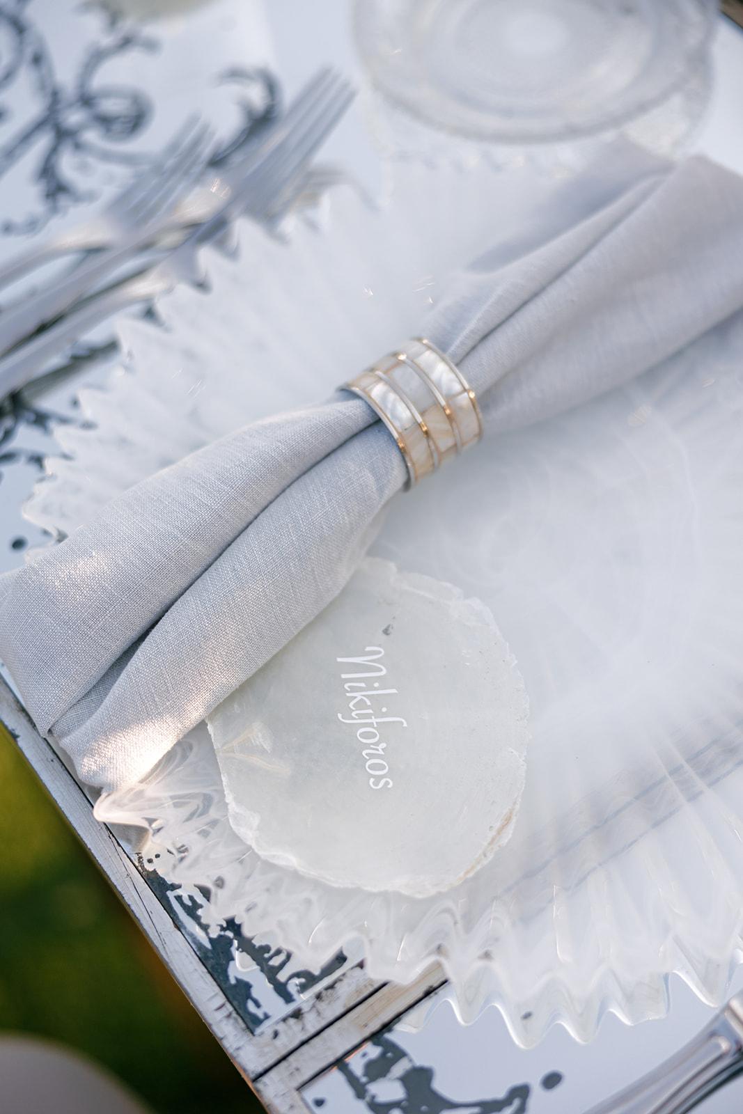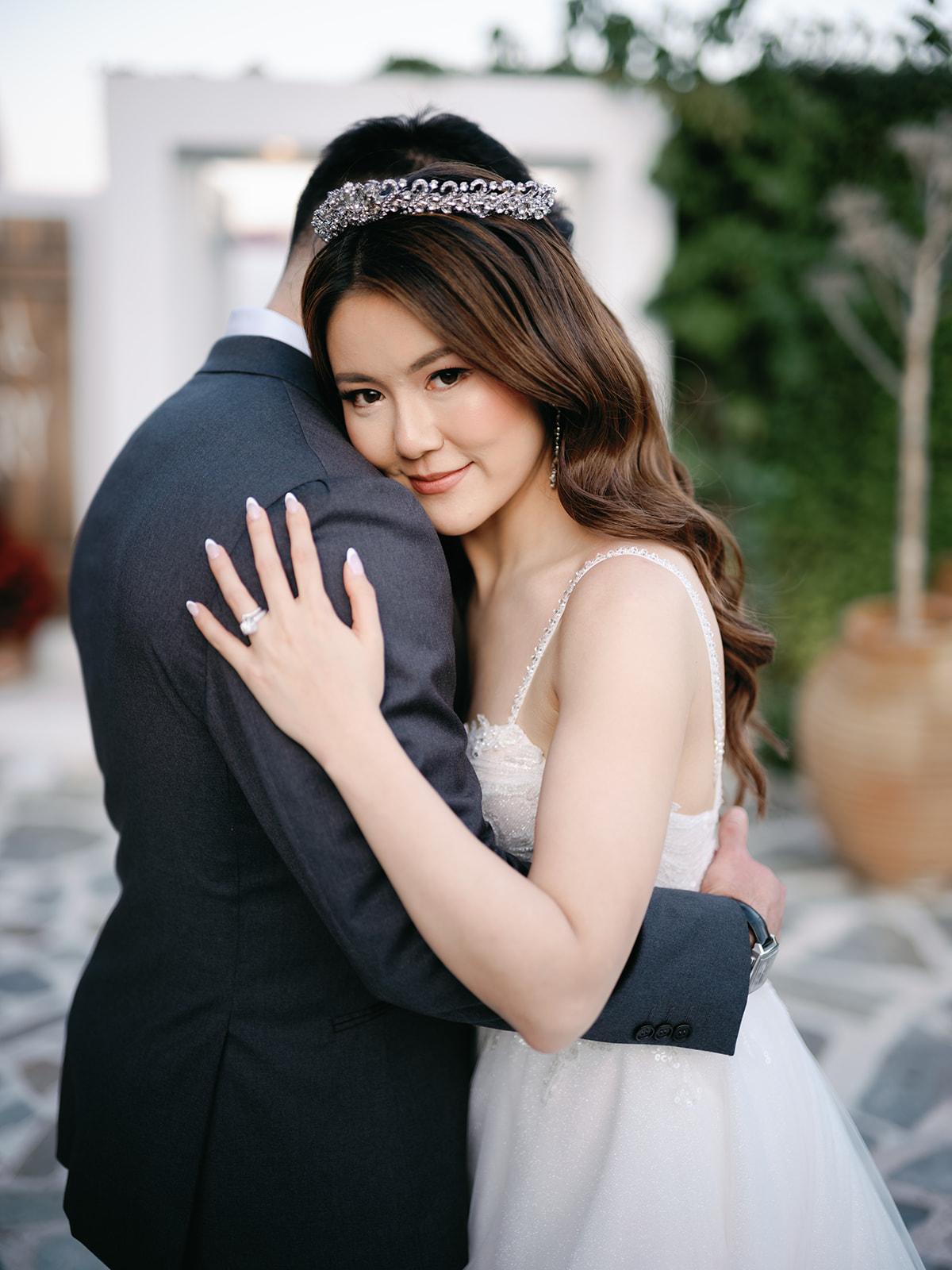 On the sun-kissed Athenian Riviera, with the Aegean Sea stretching out as far as the eye could see, a magical outdoor wedding unfolded under the theme of "Mother of Pearl Ocean." The setting was nothing short of enchanting, with a large structure gracefully hovering above the dance floor, its grandeur softened by flowing grey chiffon billowing in the gentle sea breeze. This celestial canopy set the stage for a night of love and celebration, as the bride and groom prepared to embark on their journey together.