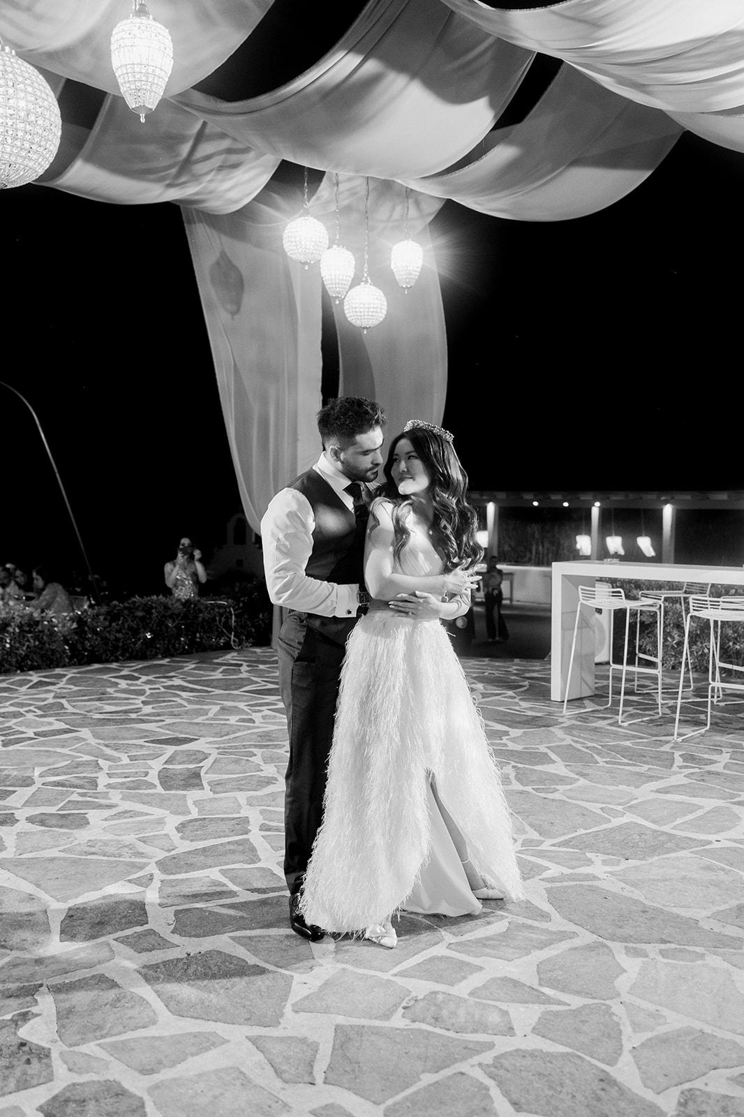 Clusters of large round chandeliers adorned the open-air dance floor, casting a warm, inviting glow that beckoned guests to dance under the starlit sky. The ambiance was ethereal, a blend of nature's beauty and human ingenuity, with the chandeliers swaying gently like constellations above. The Aegean Sea, with its deep blue expanse, served as a stunning backdrop, enhancing the sense of romance and wonder that filled the air.