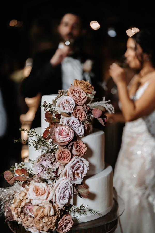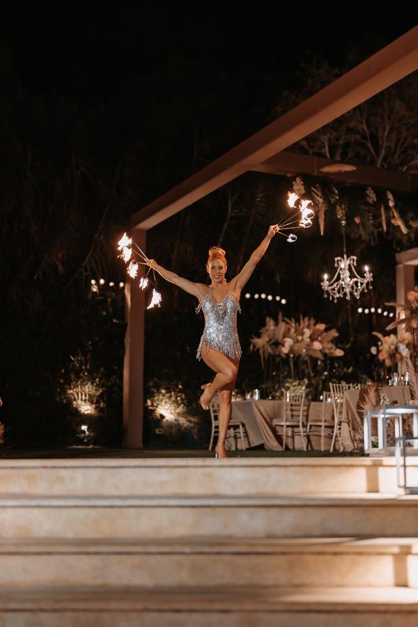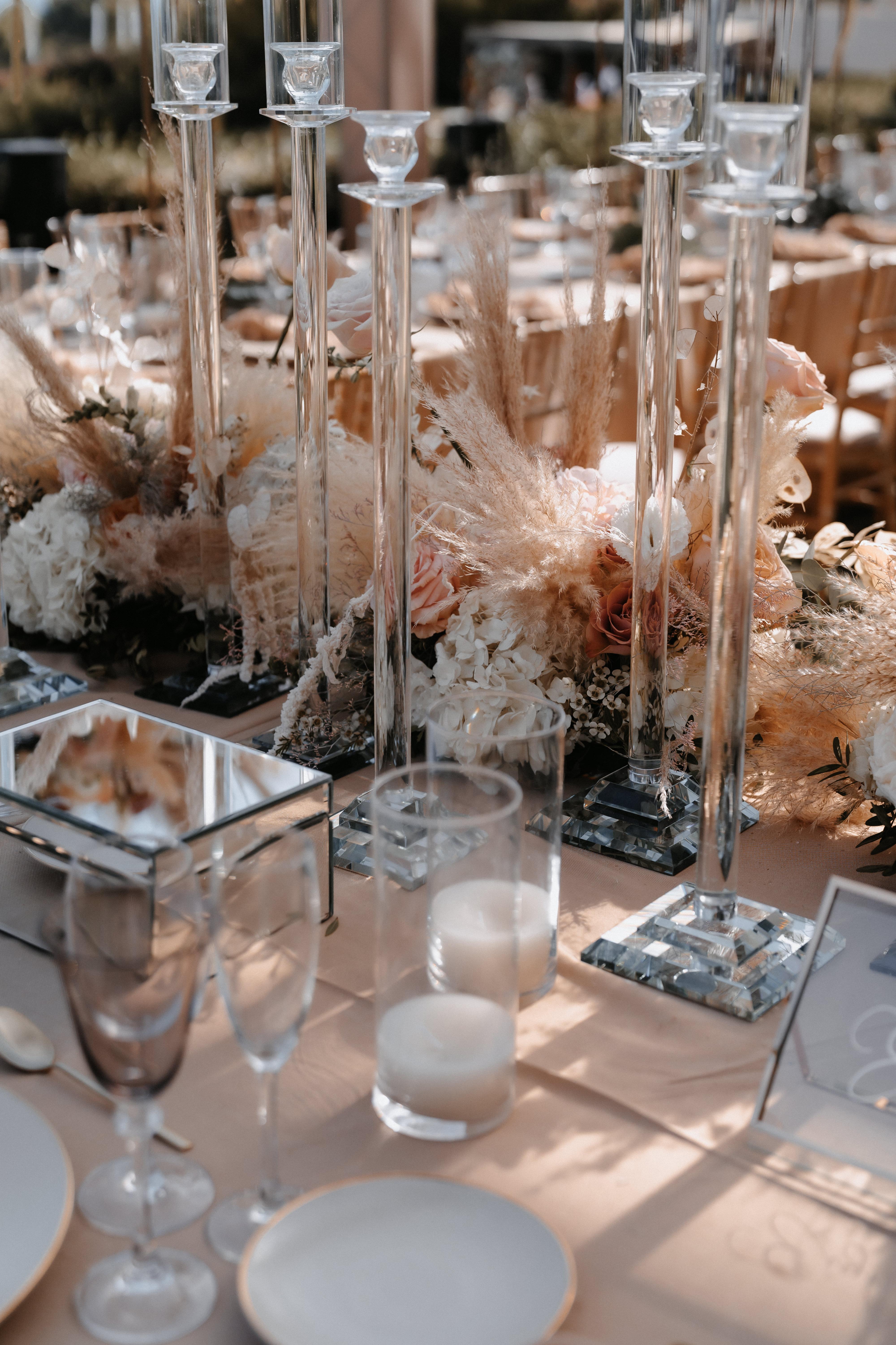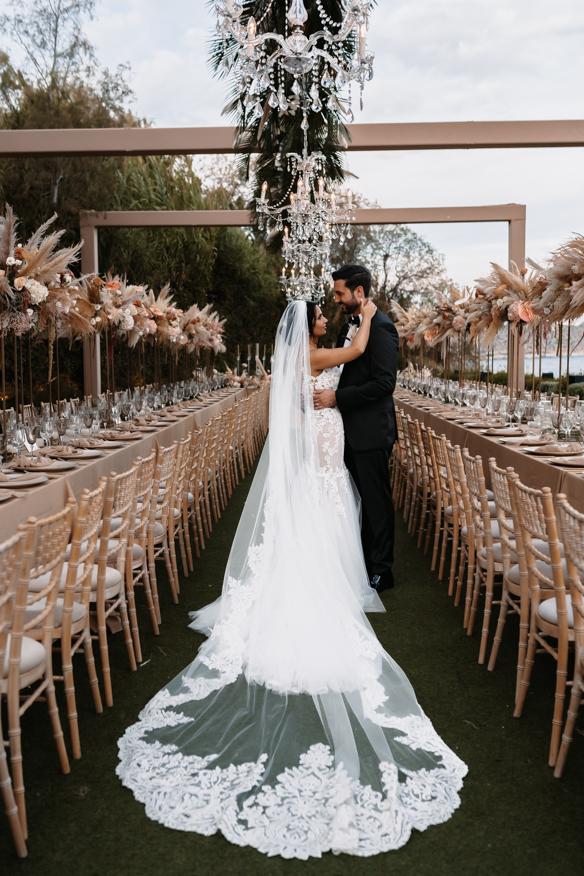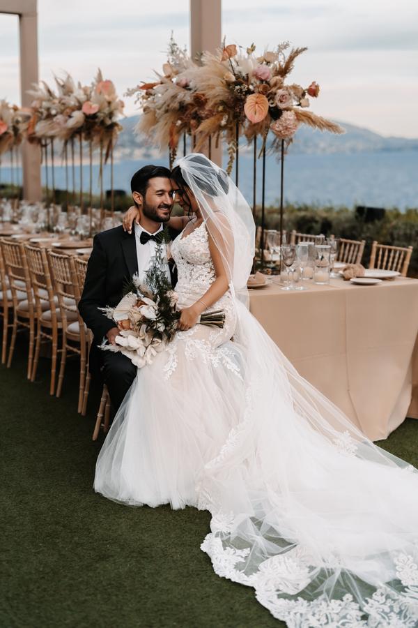 The centerpiece of their destination wedding was a breathtaking structure suspended above the U-shaped table setup. This enchanting focal point featured twinkling chandeliers, lush flowers, and verdant greenery at its core. Along the two side rows of tables, high structures adorned with stunning blooms and whimsical pampas grass enhanced the boho chic vibe, creating an atmosphere of relaxed elegance.
