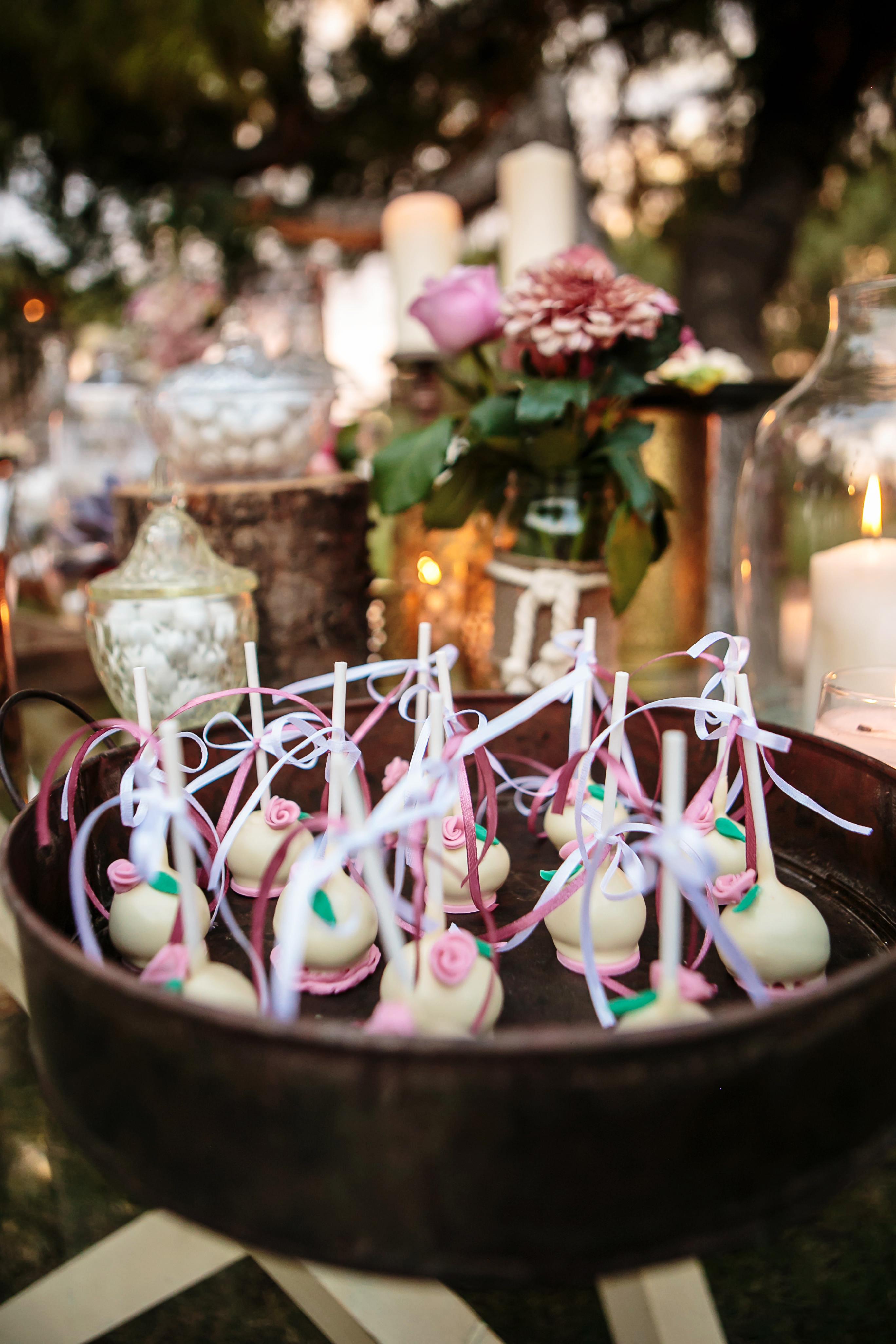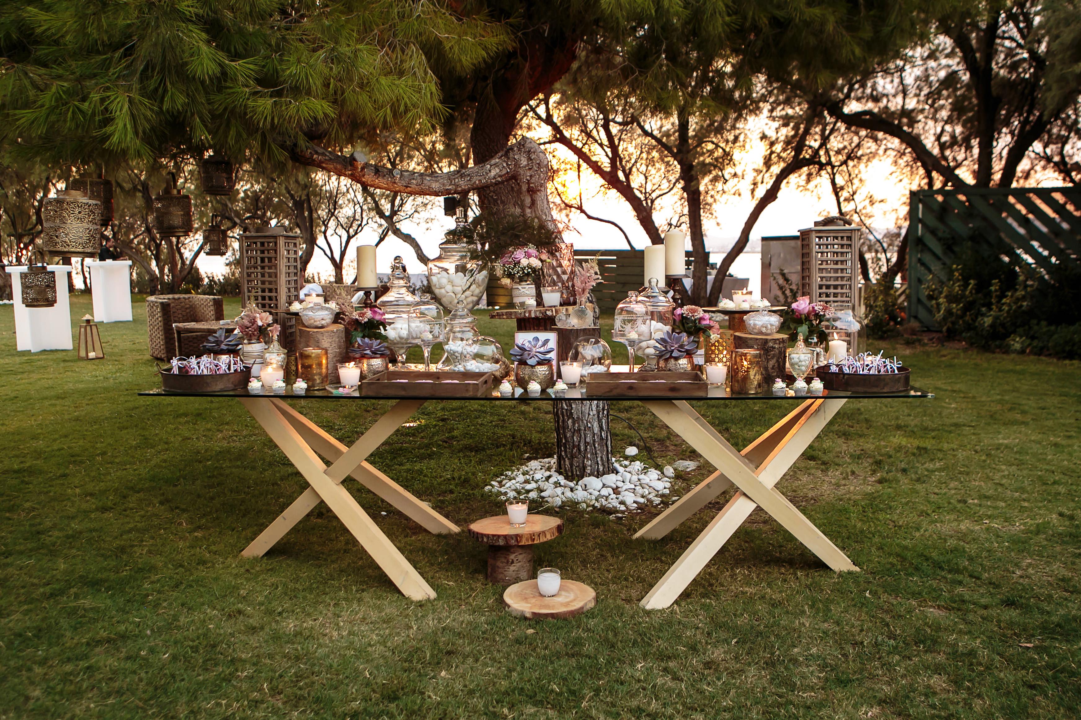 After the ceremony, guests arrived at Ble Azure which was transformed into a dazzling reception space while enjoying the Athenian sunset on the Saronic gulf. They were welcomed by a traditional Mastic cocktail and canapes while relaxing on the bamboo lounges. Guests also savoured the delicacies on the impressive, rustic sweets table which was one of the focal features at the venue. It was decorated in muted tones of pinks and gold and was placed under a tree holding ornate antique gold lanterns.
