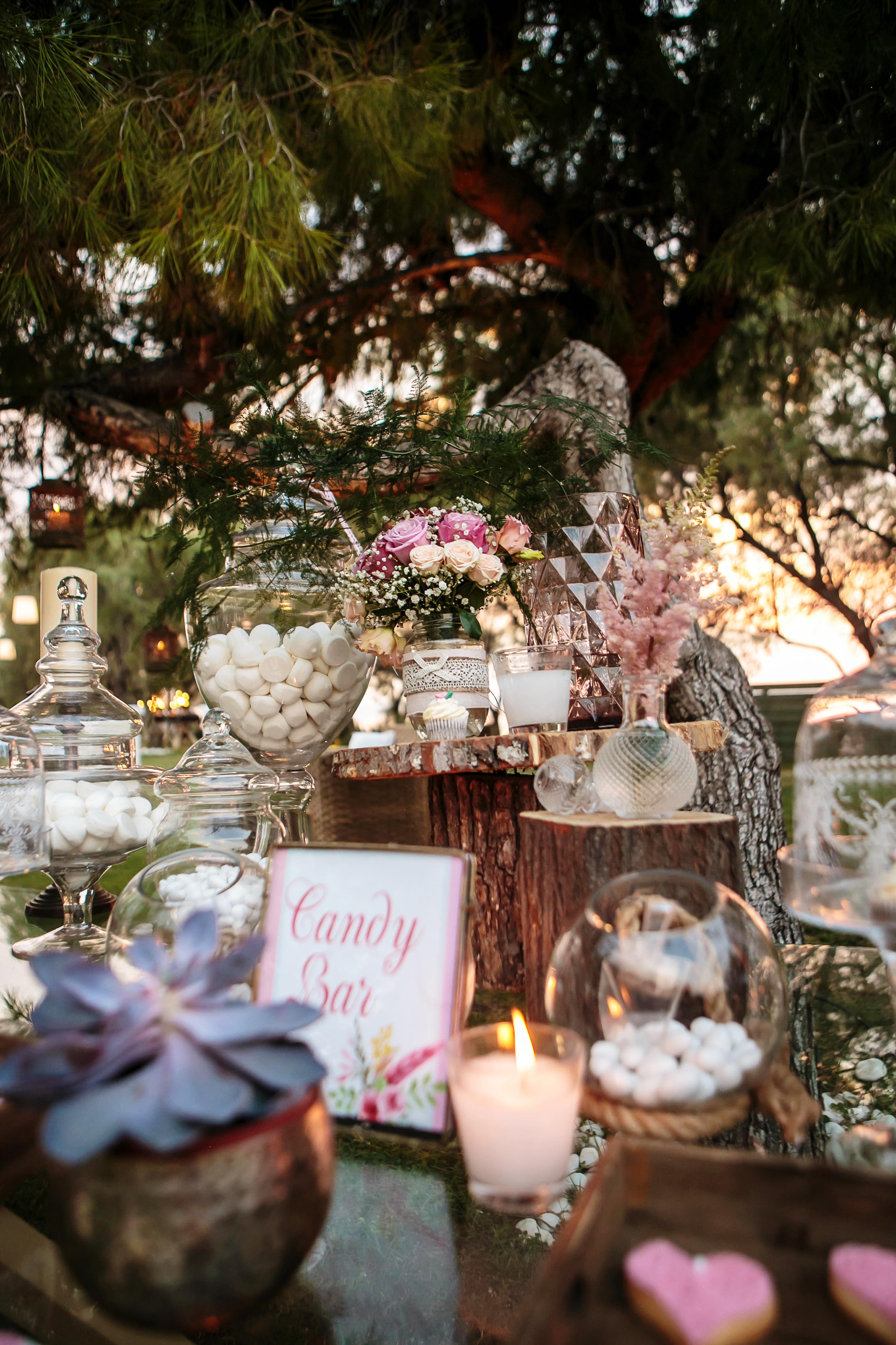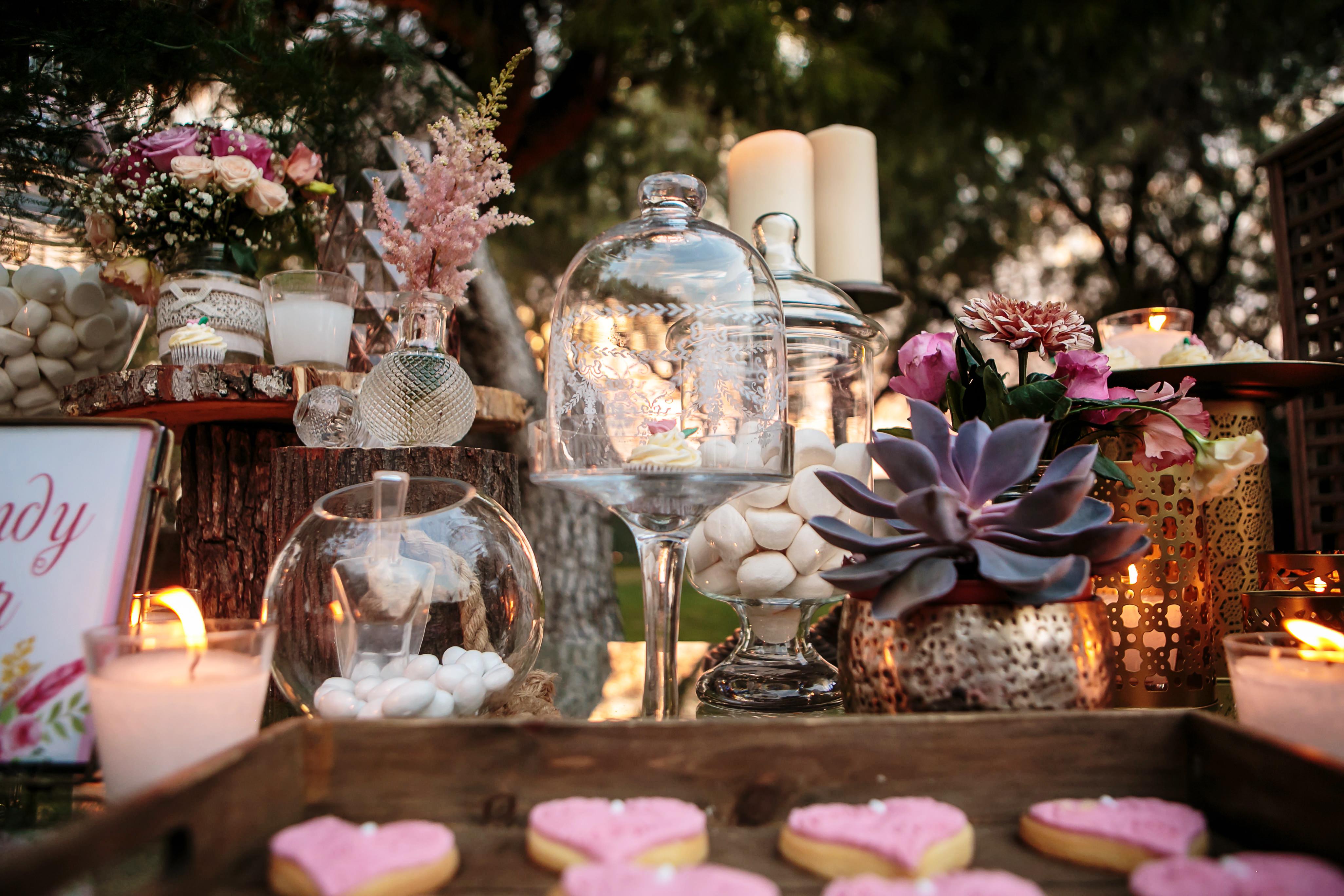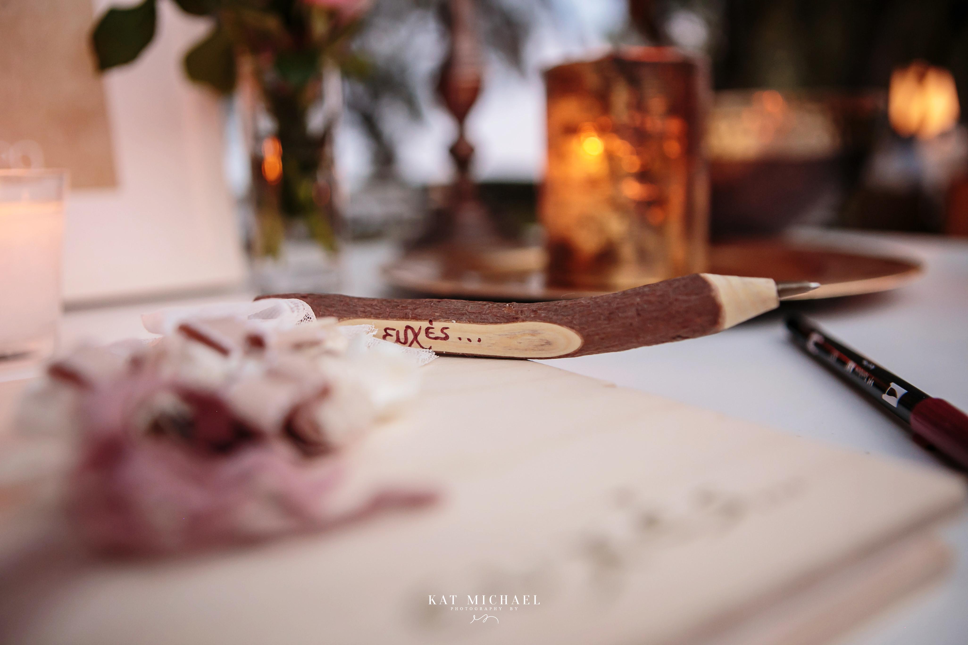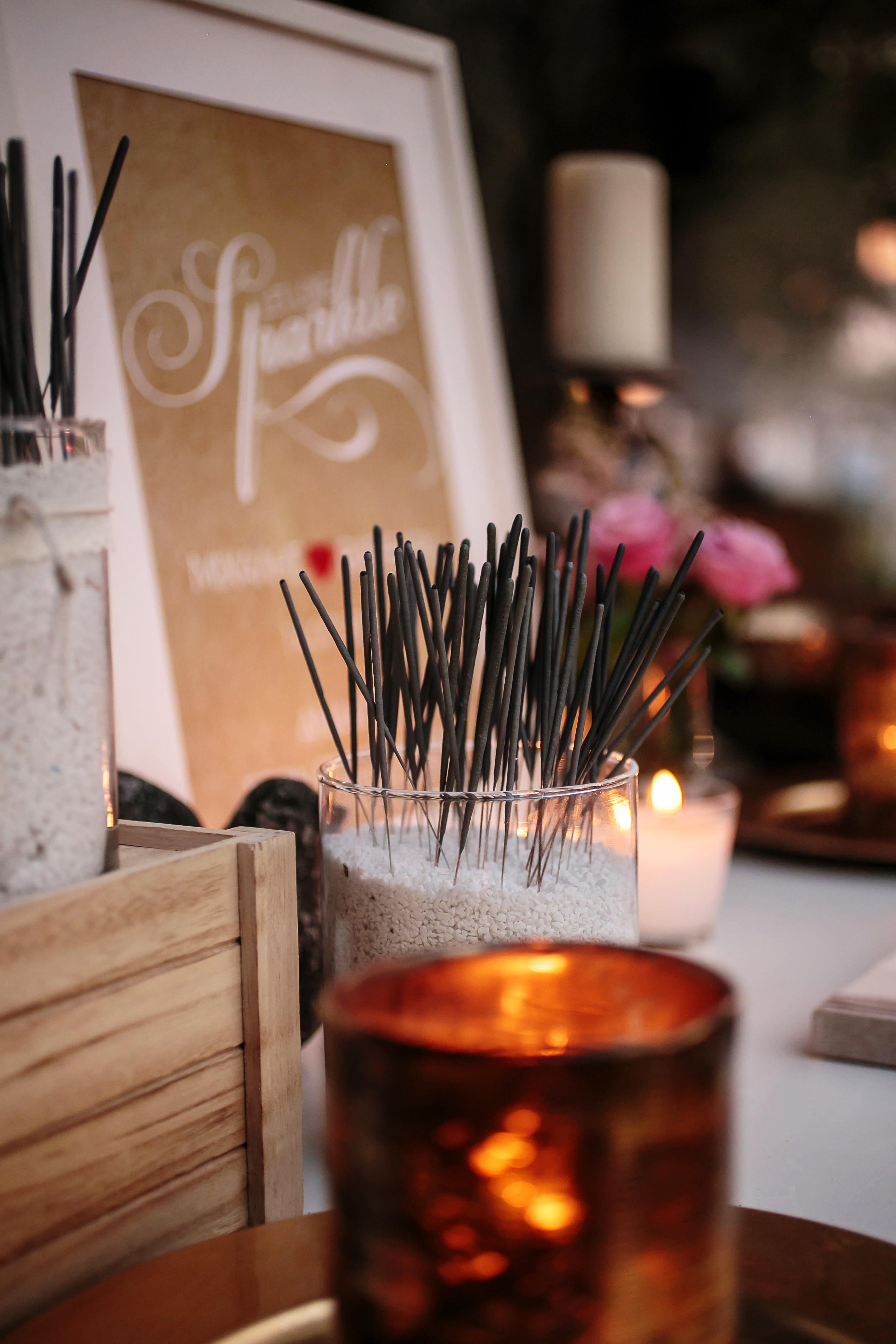 Not to be forgotten, the couple’s wooden guest book was placed on a table decorated with candles placed in mercury glass containers, flowers, succulents and a vase filled with sparklers for the couples magical first dance.