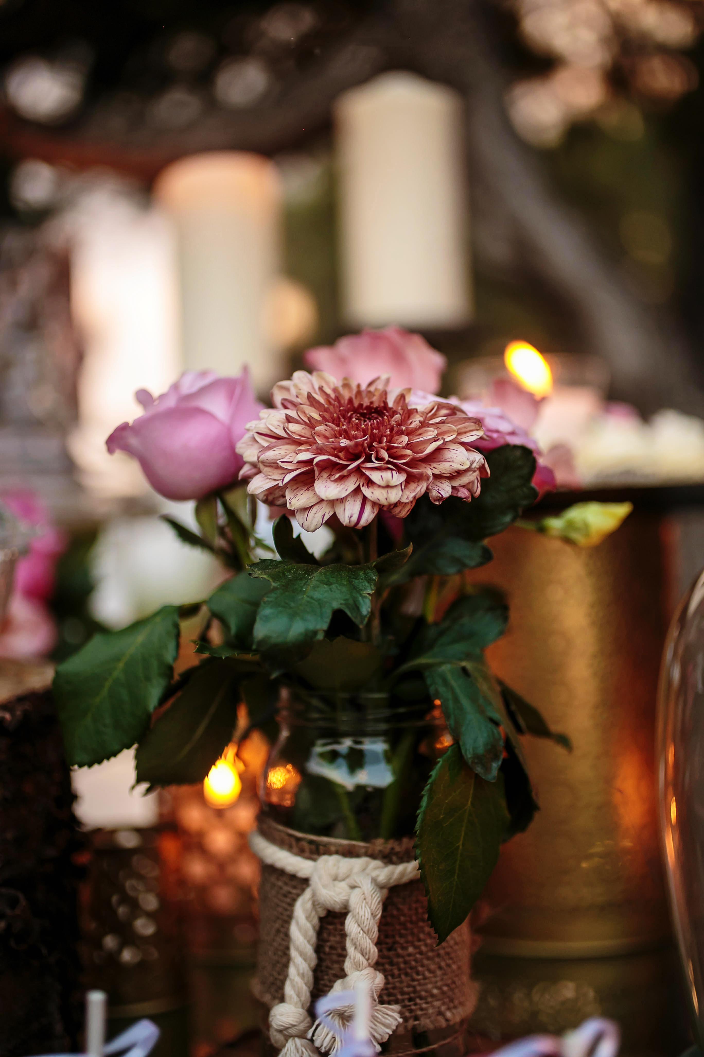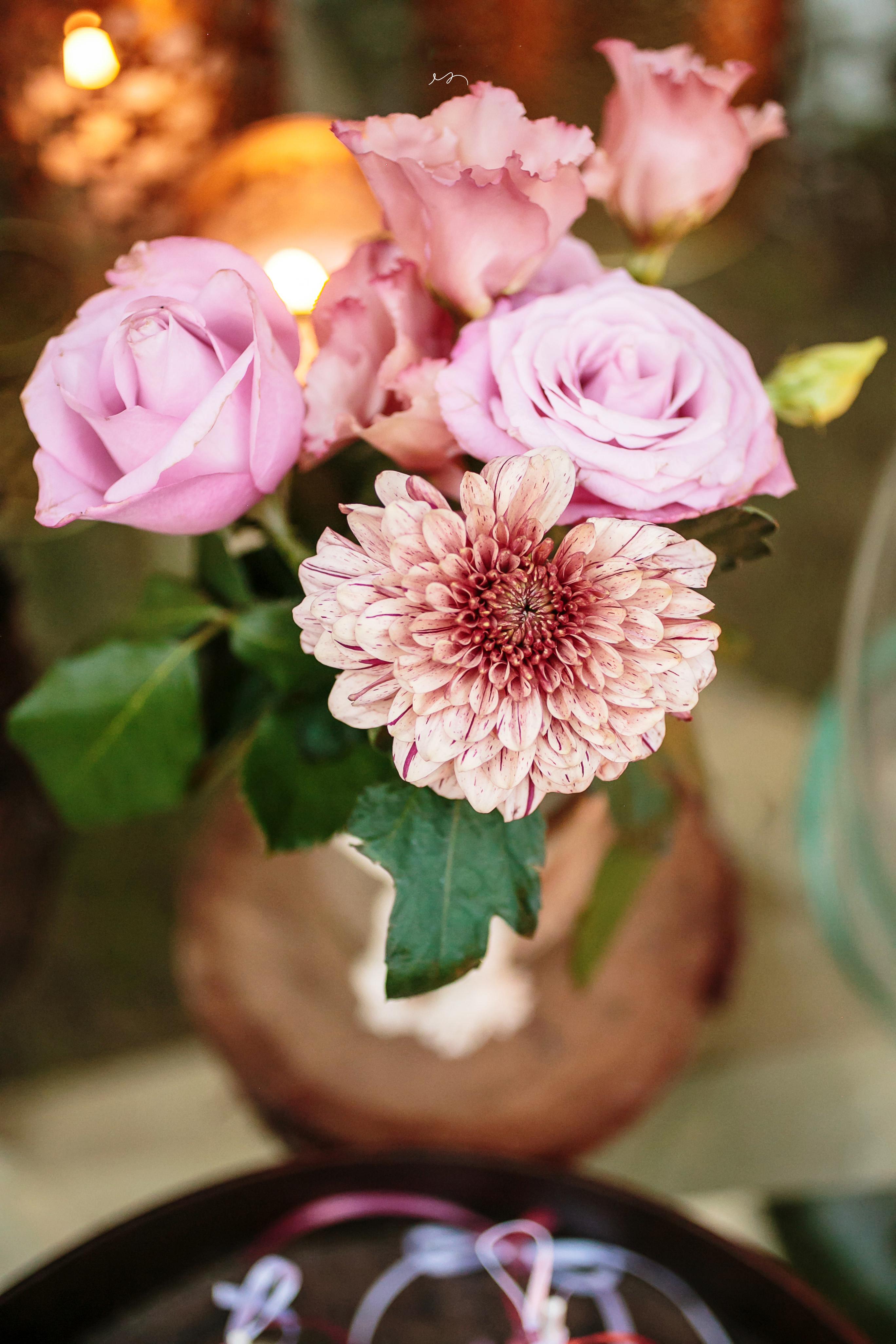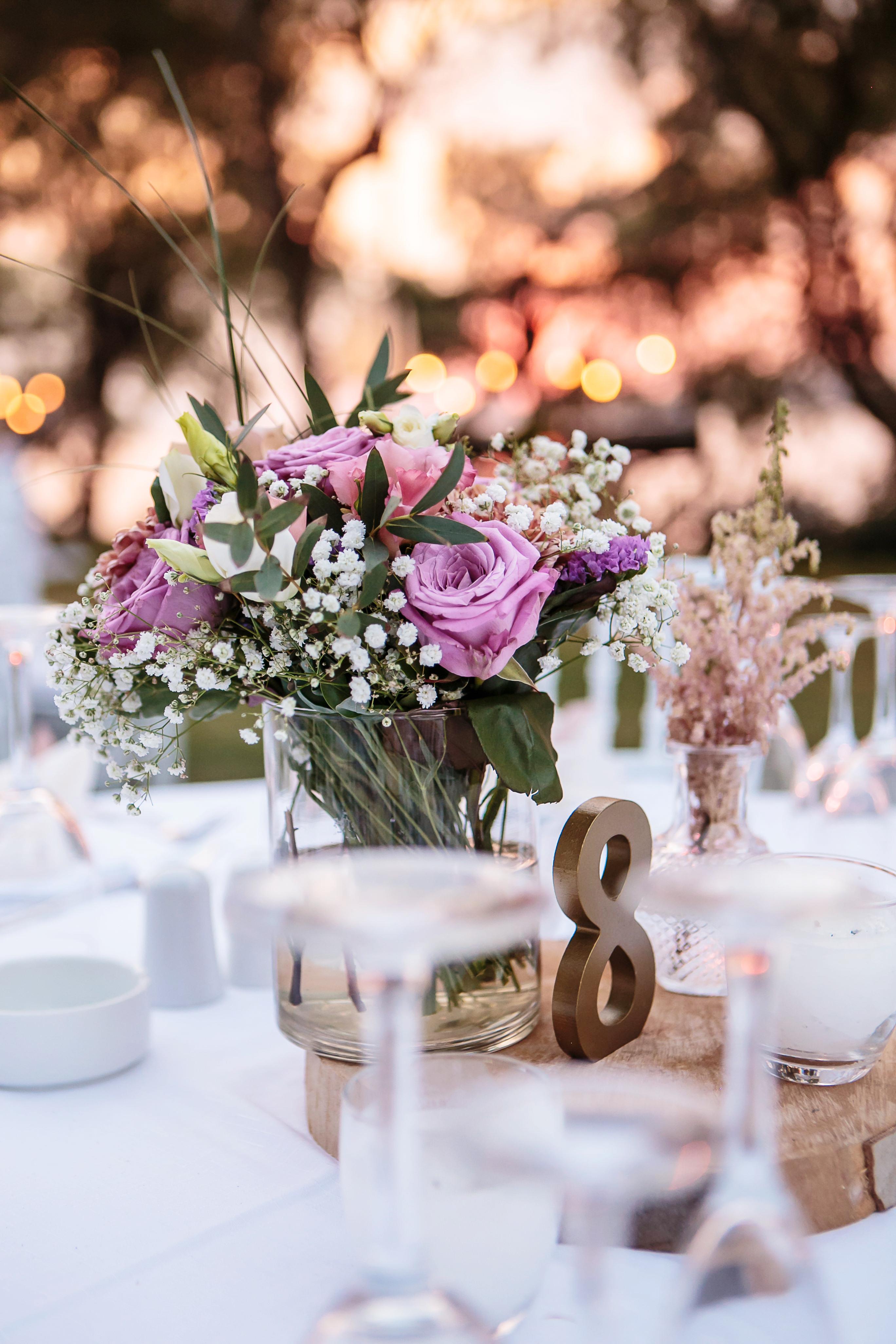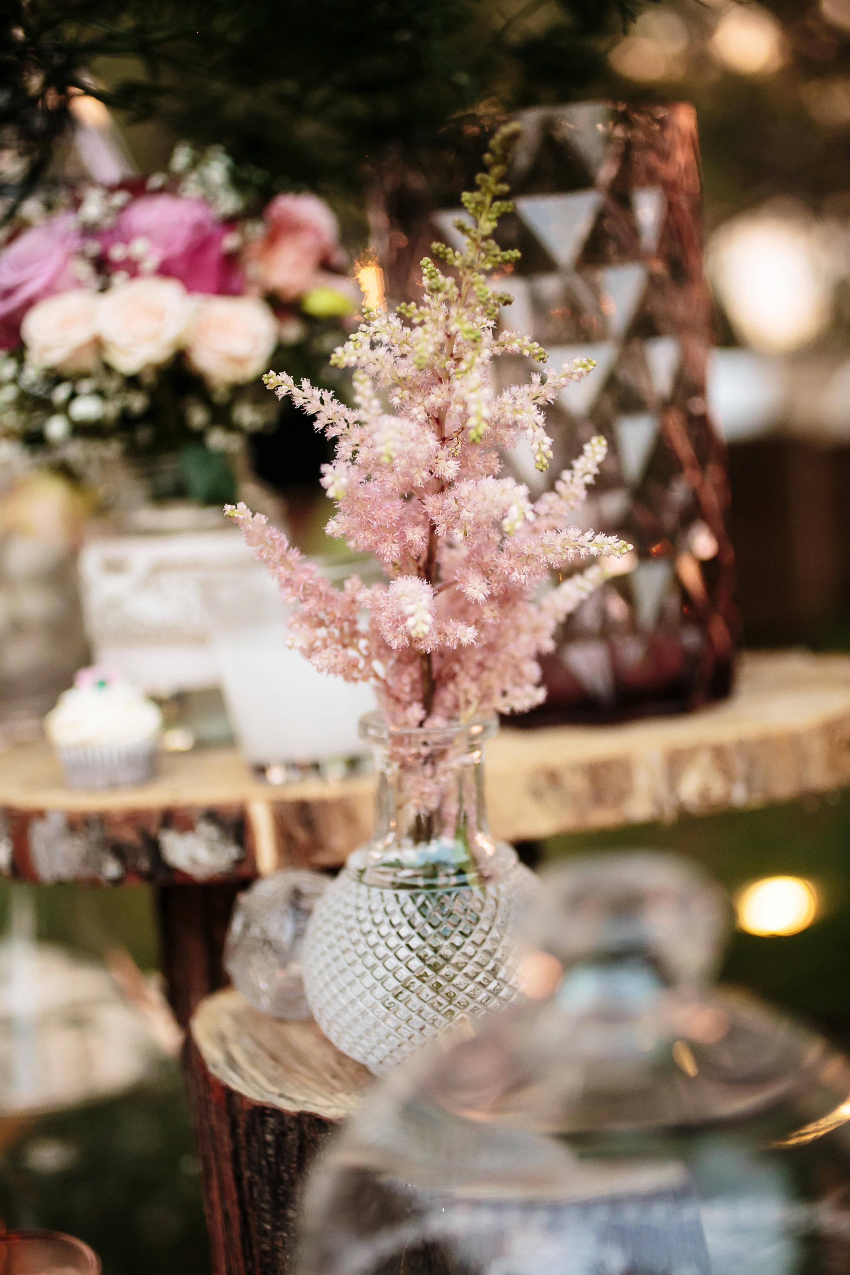 The subdued romantic florals such as pink garden roses, lisianthus, baby’s breath and Anastasia were placed on a wooden log and accompanied by an antique crystal vase holding a single pink astilbe. Votive candles provided soft lighting and a gold wooden table number completed the look, which filled the center of each table.