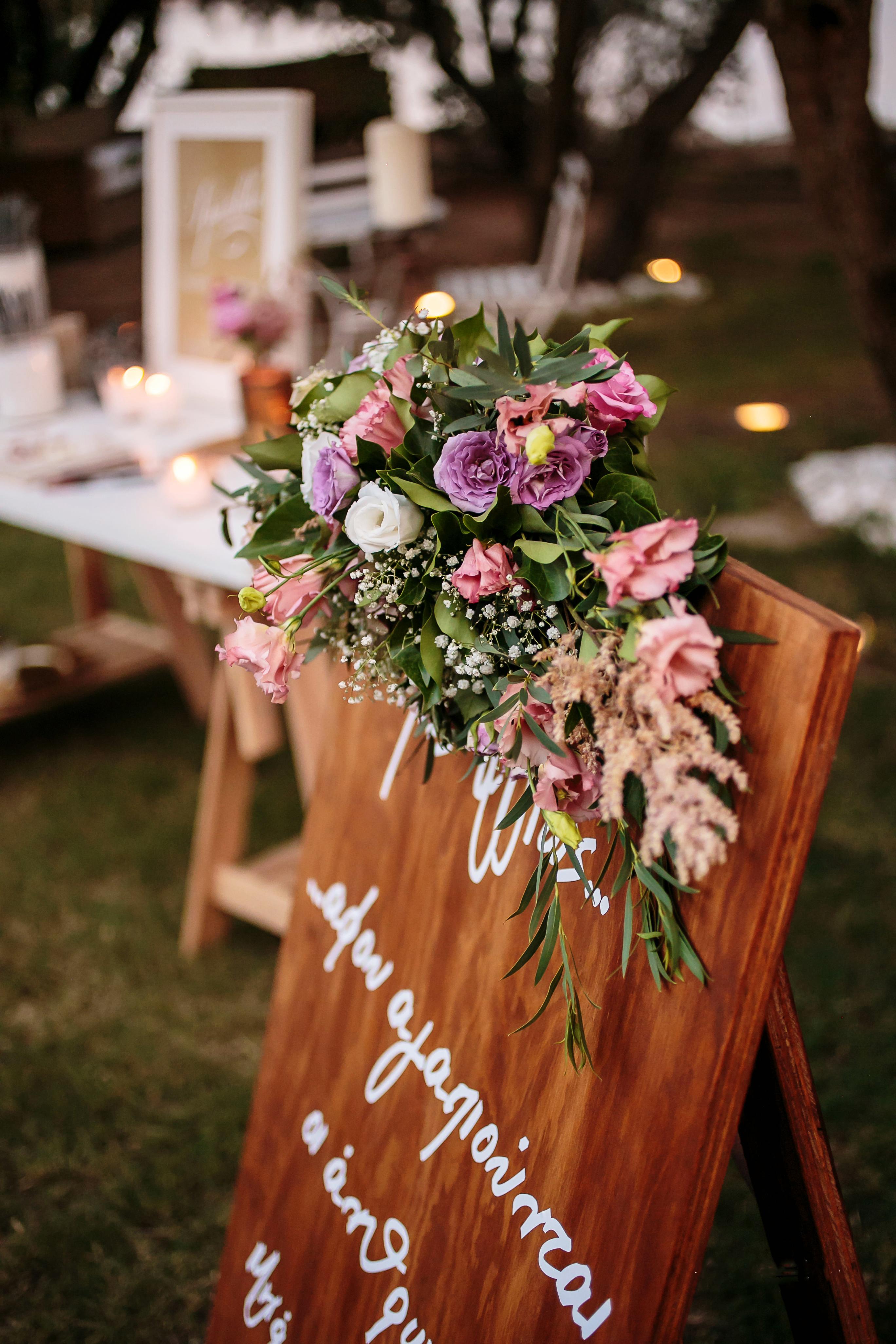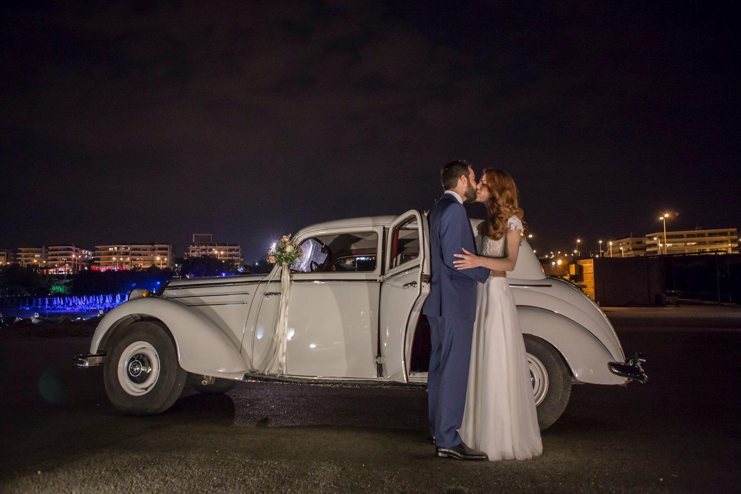 The ceremony took place just before sunset at an idyllic, whitewashed church nestled under billowing pine trees on the exquisite Athenian Riviera. The bride arrived in an off-white vintage Buick accompanied by her overwhelmed father who handed over his daughter to Michael who upon tradition was holding the vintage styled bridal bouquet. The ceremony candles and bridal bouquet were decorated with flowers such as hydrangea, peonies, astilbe, lisianthus and roses in muted tones of puce, pink and green.